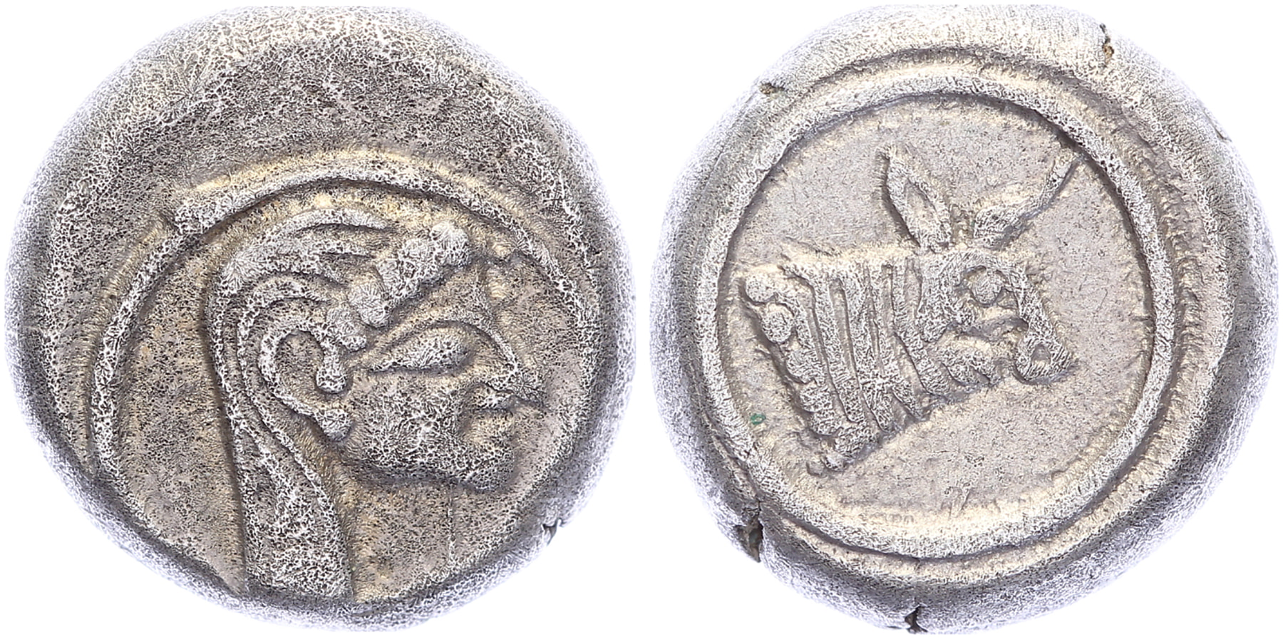Circa 5th century BC. BI Hemidrachm [2,30 gm, 11,9 mm]. Archaic female head right / Head of bull right. SNG BM Black Sea 1013; SNG Copenhagen 98. Porous, VF.Purchased from Willem van Alsenoy, May 1999 (Leuven coin fair)