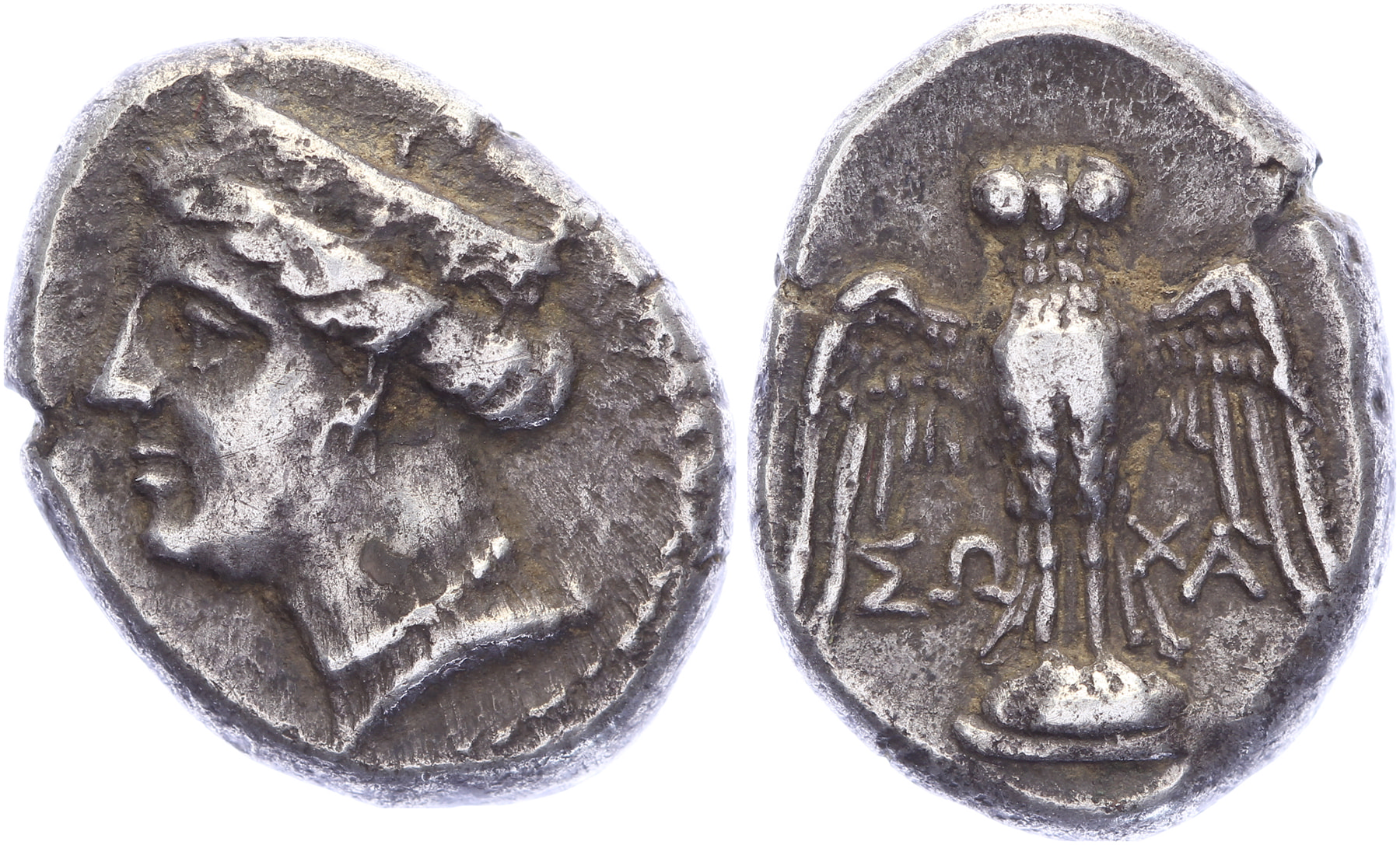 4th century BC. AR Siglos [5,39 gm, 15,6 mm]. Head of Hera left, wearing ornamented stephanos / ΣΩ-XA, owl, with wings spread, standing facing on shield; club to left. SNG BM Black Sea 1095. Rare. Toned VF.