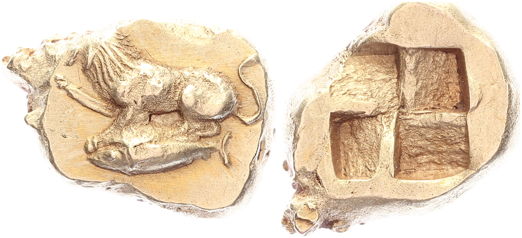 Circa 500-475 BC. EL Hekte [2,61 gm, 11,3 mm]. Lion to left; tunny below / Quadripartite incuse square. SNG BN Paris 216. Dies a bit rusty, obverse off centre, EF. Purchased from Tom Vossen, October 2009