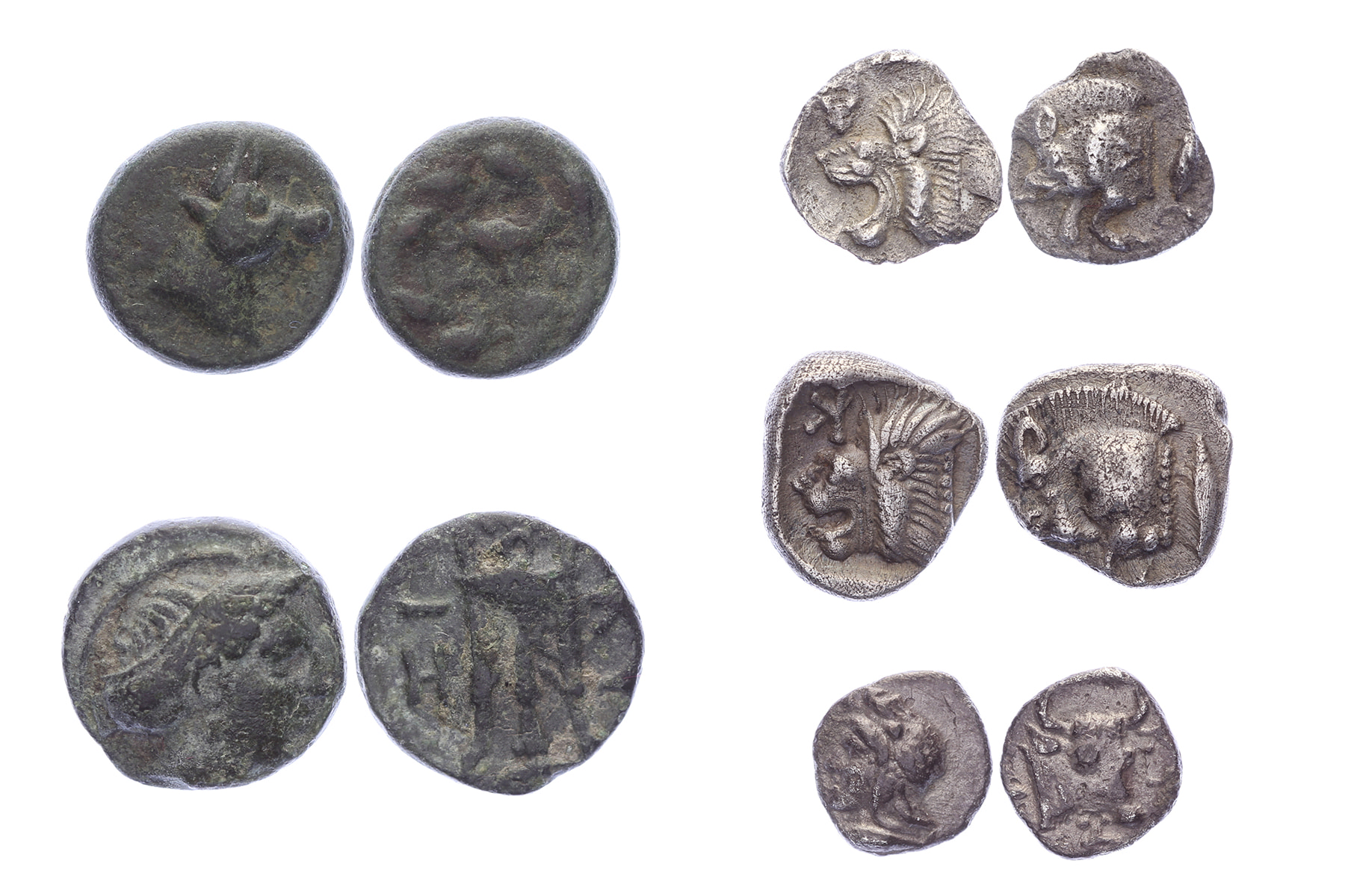 Lot (5) Circa 450-400 BC. AR Hemiobol [0,33 gm, 7,1 mm]; Circa 510-475 BC. AR Obol [0,83 gm, 9,3 mm]; AR Hemiobol [0,34 gm, 8 mm]; 3rd century BC. Æ 11 [1,27 gm, 10,6 mm]; 2nd-1st centuries BC. Æ [1,60 gm, 11 mm]. aVF.Uitgebreide beschrijving van de munten bij lot ingesloten. / Comprehensive description accompanies this lot.