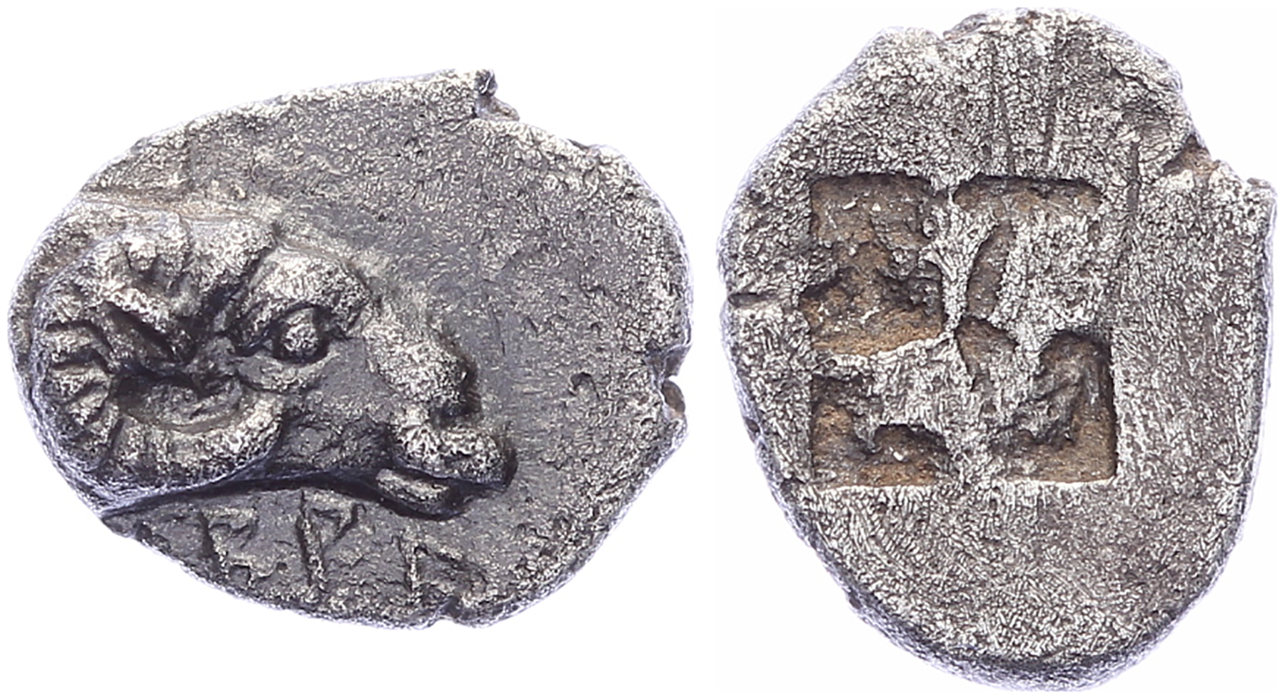 Circa 480-440 BC. AR Hemiobol [0,34 gm, 8,5 mm]. KEB; ram’s head right / Quadripartite incuse square. SNG Copenhagen 256. Nice VF.Purchased from Tom Vossen, Beurs, November 2017 (Tienen coin fair)