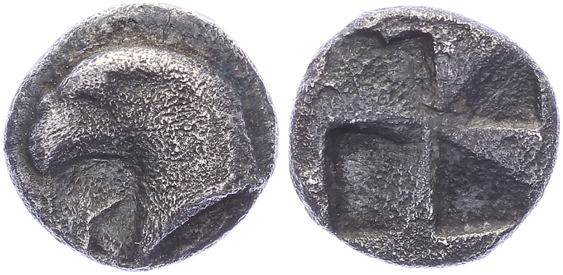 Circa 450-400 BC. AR Hemiobol [0,41 gm, 7,9 mm]. K Y, Eagle’s head left / Granulated “mill-sail” incuse square. SNG Copenhagen 33. Granular surfaces, VF.Purchased from Mr. Moreaux, May 1996