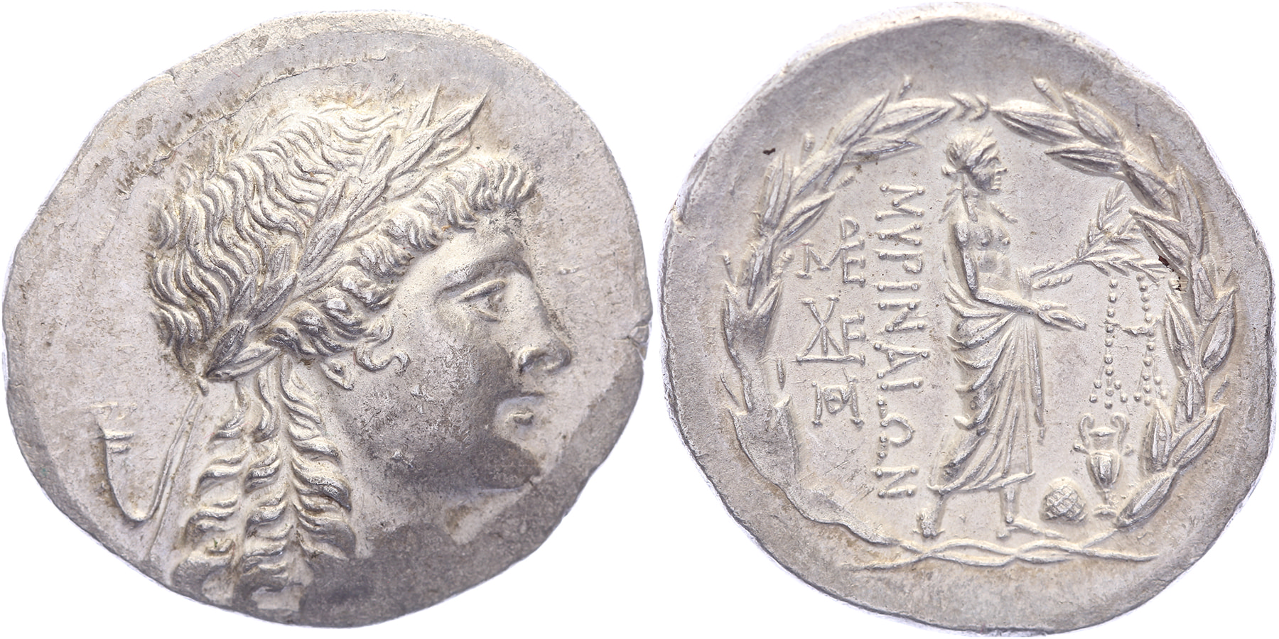 Circa 160-143 BC. AR Tetradrachm [16,41 gm, 32,7 mm]. Stephanophoric issue. Laureate head of Apollo to right / MΥΡINAIΩN, Apollo Grynios standing right, holding laurel branch in his left hand and phiale in his right; at his feet to right, omphalos and amphora; in field to left, three monograms; all within laurel wreath. Sacks-Issue 30. aEF.Purchased from Jean Elsen, Beurs Tienen, November 1995