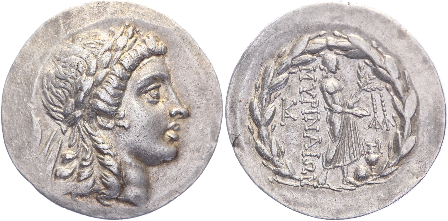 Circa 160-143 BC. AR Tetradrachm [16,73 gm, 33,1 mm]. Stephanophoric issue. Laureate head of Apollo right / MΥΡINAIΩN, Apollo Grynios standing right, holding laurel branch in left hand and phiale in his right, at his feet to right, omphalos and amphora; monogram to left. Sacks-Issue 19; BMC 11; SNG Copenhagen 211. gVF.Purchased from Jean Elsen, November 1996, list 183 #47