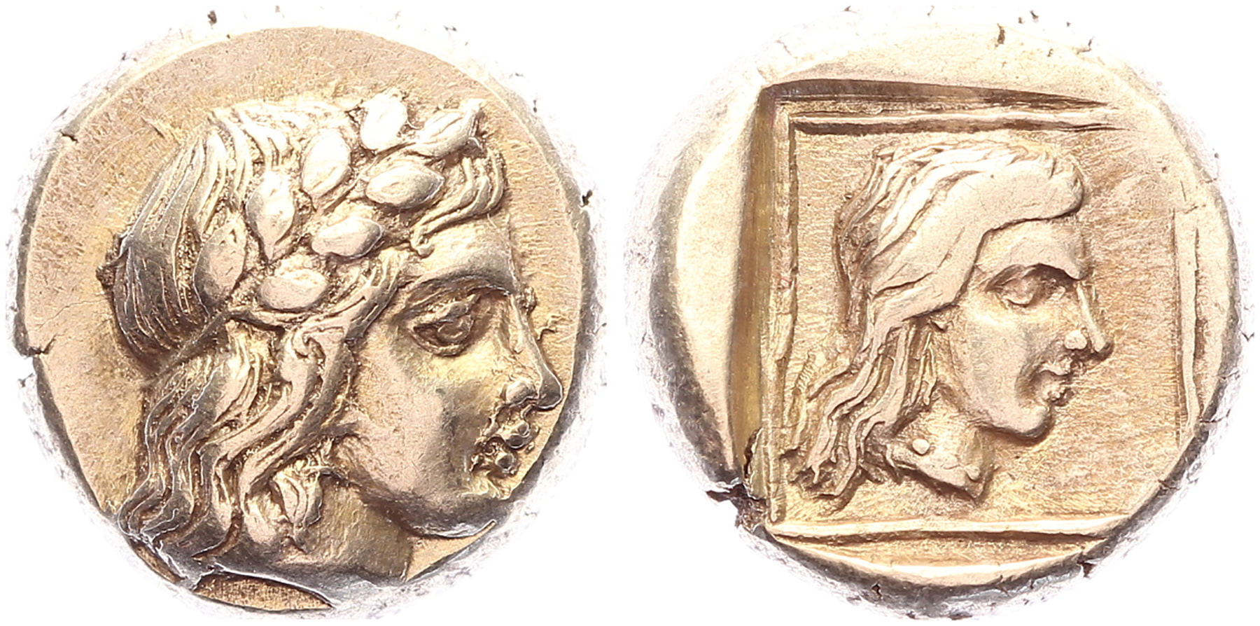 Circa 412-378 BC. EL Hekte [2,55 gm, 10,1 mm]. Laureate head of Apollo right / Female head right in incuse square. Bodenstedt Em. 70. Small die break on the obverse, aEF.
