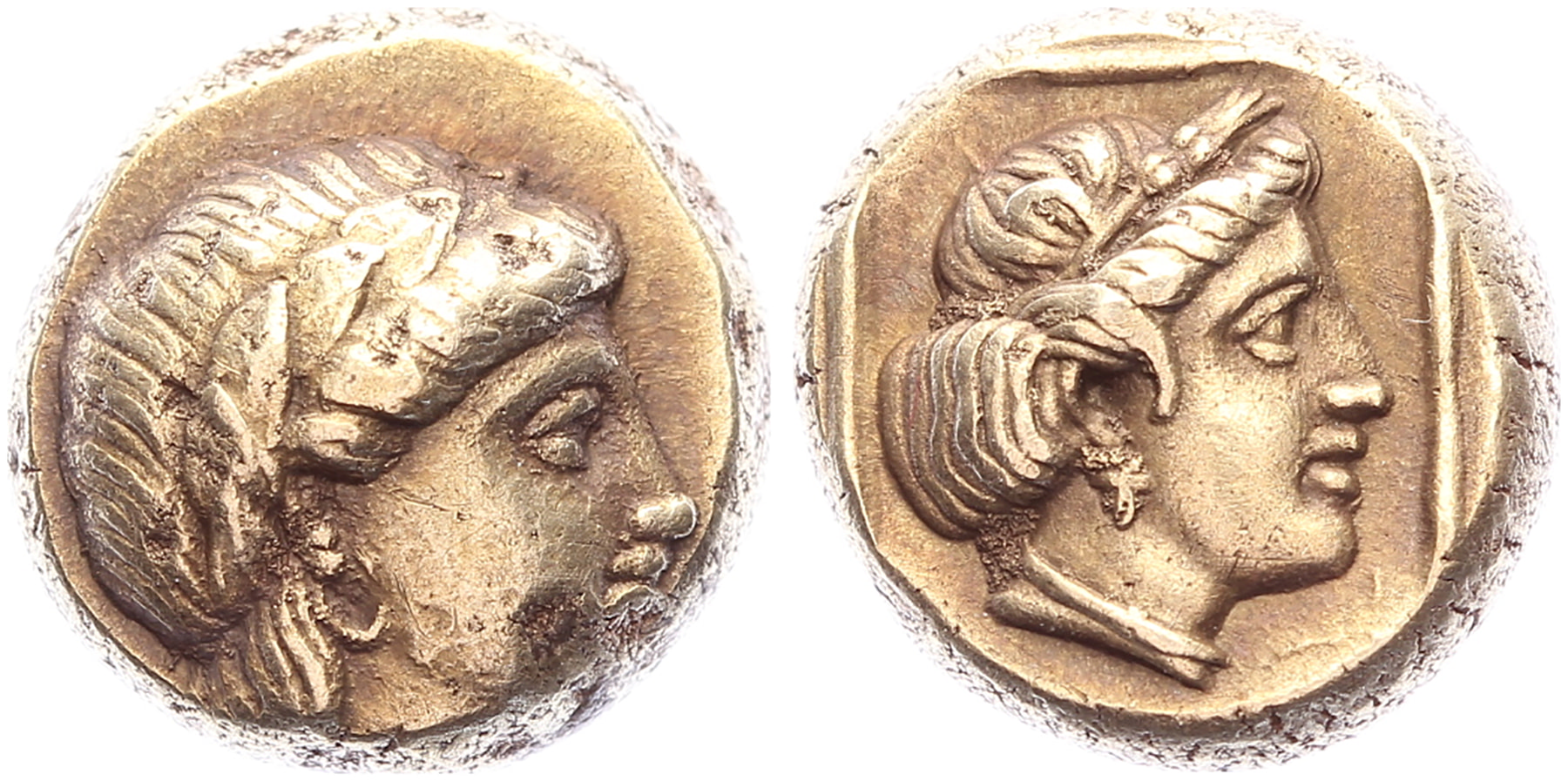 Circa 377-326 BC. EL Hekte [2,56 gm, 9,2 mm]. Laureate head of Apollo to right / Head of a female to right within linear square. Bodenstedt 95; SNG von Aulock 1716; Leu Webauc. 26, lot 1092 (same dies). Minor die rust, gVF. Purchased from Gijs Henzen, October 1994