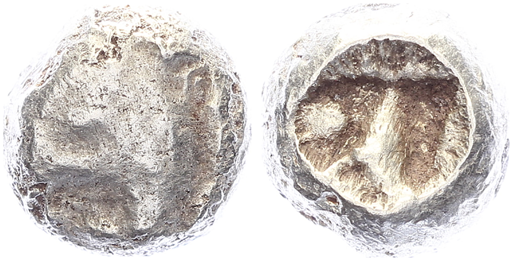 Circa 600-550 BC. EL Hemihekte [0,93 gm, 6,8 mm]. Lydo-Milesian standard. Head of serpent(?) left, with open jaw and lolling tongue / volute design within conforming incuse. Cf. SNG Kayhan 1538 (hekte of issue, with volute design in one incuse); CNG 94, lot 598; Triton XIII, lot 1310; CNG E-249, lot 143. Rare. VF.Purchased from Tom Vossen, November 2003