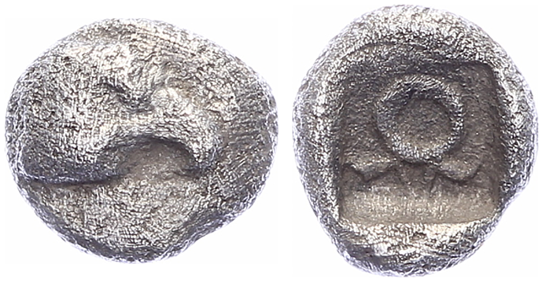 5th century BC. AR Tetartemorion [0,17 gm, 5,5 mm]. Head of eagle right / Wreath in incuse square. CNG 88, lot 340; Hauck & Aufhäuser 15, lot 164; otherwise unpublished. Granular surfaces, VF.Purchased from Tom Vossen, December 2006