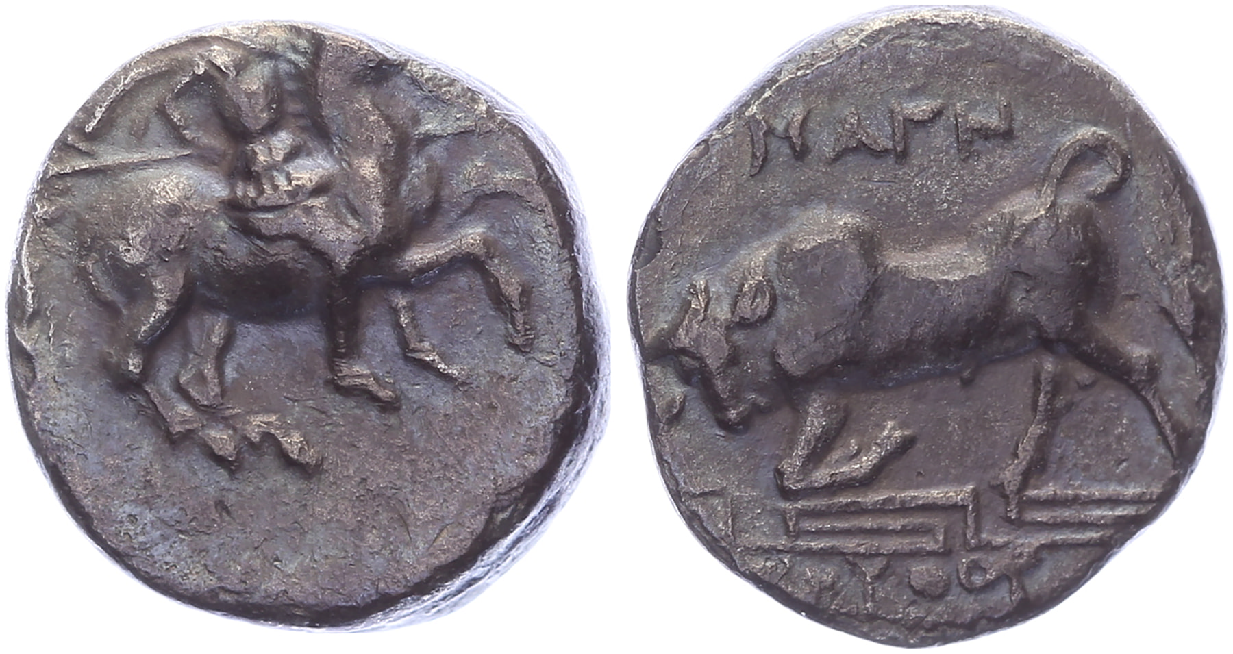 Circa 350-325 BC. AR Hemidrachm [1,37 gm, 11,5 mm]. Rhodian standard. Skythos, magistrate. Warrior, holding lance, on horse rearing right / MAΓN / ΣKYΘOY, bull butting left; maeander pattern below; grain ear behind. SNG Kayhan 414; SNG Copenhagen 808. Obverse off centre, darkly toned, gVF.Purchased from R. Wickert Ulm, February 1999 (München coin fair)