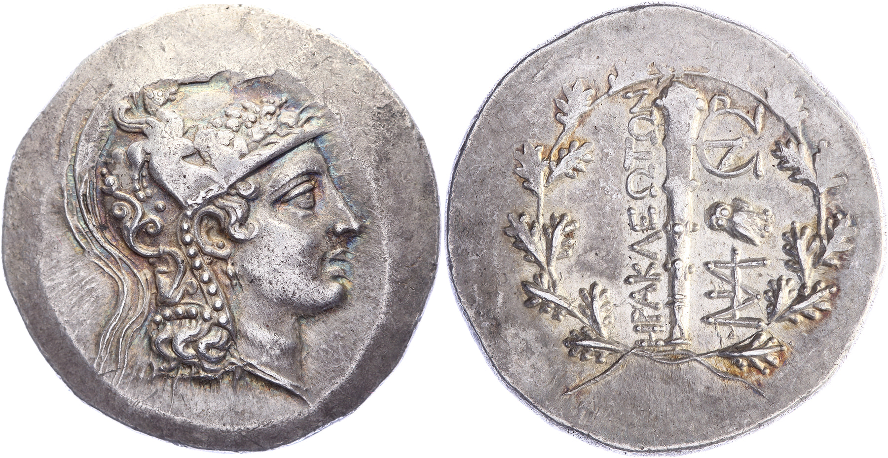 Circa 150-142 BC. Tetradrachm [16,78 gm, 31,2 mm]. Head of Athena to right, wearing triple-crested Attic helmet with raised ear flaps, a bowl ornamented with tendrils and Pegasos, and a visor decorated with six horse protomes, a pendant earring and a pearl necklace / ΗΡΑΚΛΕΩΤΩΝ, club to right; below, owl standing facing, turned slightly to right, between two monograms; all within an oak wreath tied on the left. SNG Lockett 2824. SNG von Aulock 1977. Toned gVF.Purchased from Jean Elsen, December 1997, lot 52