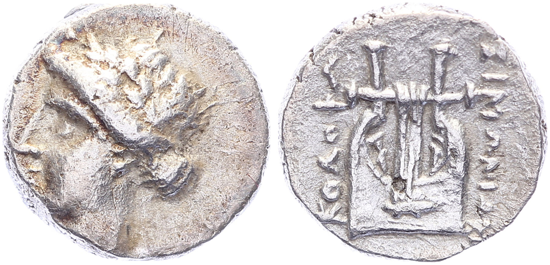 Circa 375-360 BC. AR Diobol [1,00 gm, 9,8 mm]. Simonides, magistrate. Laureate head of Apollo left / KOΛOΦΩ ΣΙΜΩΝΙΔΗΣ, lyre. Naumann Auc. 18, lot 242 (same dies). Otherwise unpublished magistrate. Obv. a bit off centre, VF.Purchased from Tom Vossen, 2006 (#4493)