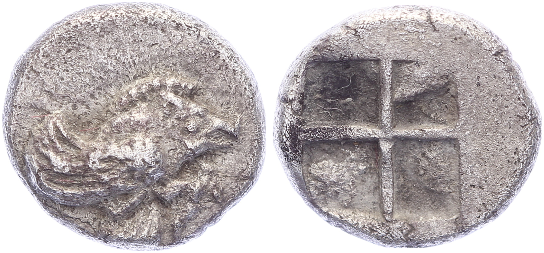 5th century BC. AR Diobol (1.09 gm, 9mm). Forepart of winged boar right / Quadripartite square incuse. SNG von Aulock 1983; SNG Helsinki 243. A bit porous, VF.Purchased from Tom Vossen, May 2002 (Leuven coin fair)