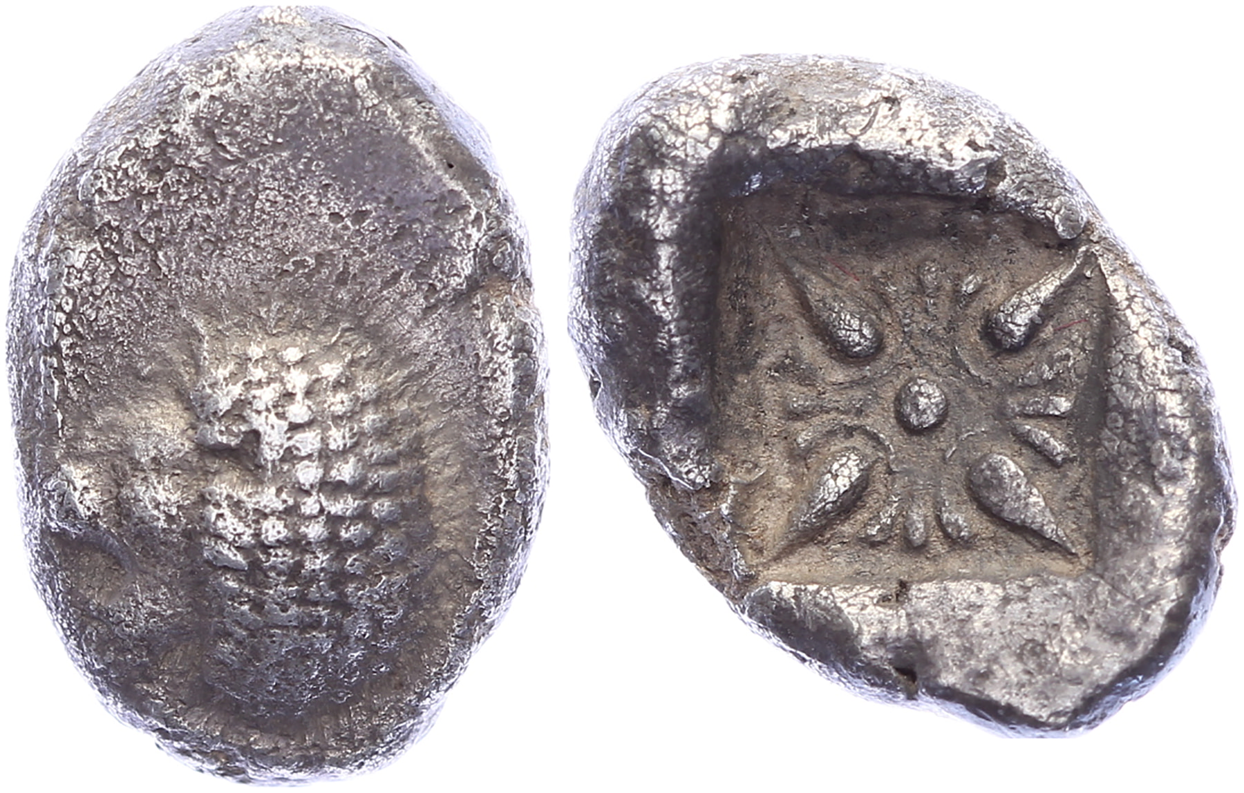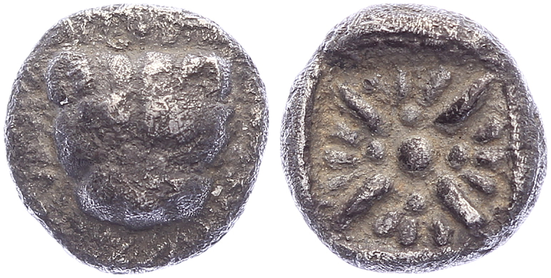 Lot (2) Circa 550-525 BC. AR 1/32 Stater [0,36 gm, 6 mm]. Facing lion’s head / Incuse square with star. Klein, Sammlung von Griechischen Kleinsilbermünzen und Bronzen, 423; SNG München 713. Very Rare. A bit rough, aVF; Late 6th- early 4th Century BC. AR Diobol / 1/12th Stater [1,18 gm, 8,2 mm]. Forepart of lion left with head reverted / Starlike floral design in square incuse. SNG Kayhan 476-82; SNG Keckman 273; SNG von Aulock 2080. Oblong flan, a bit rough toned VF.Purchased from Tom Vossen, February 2007 (#4497)