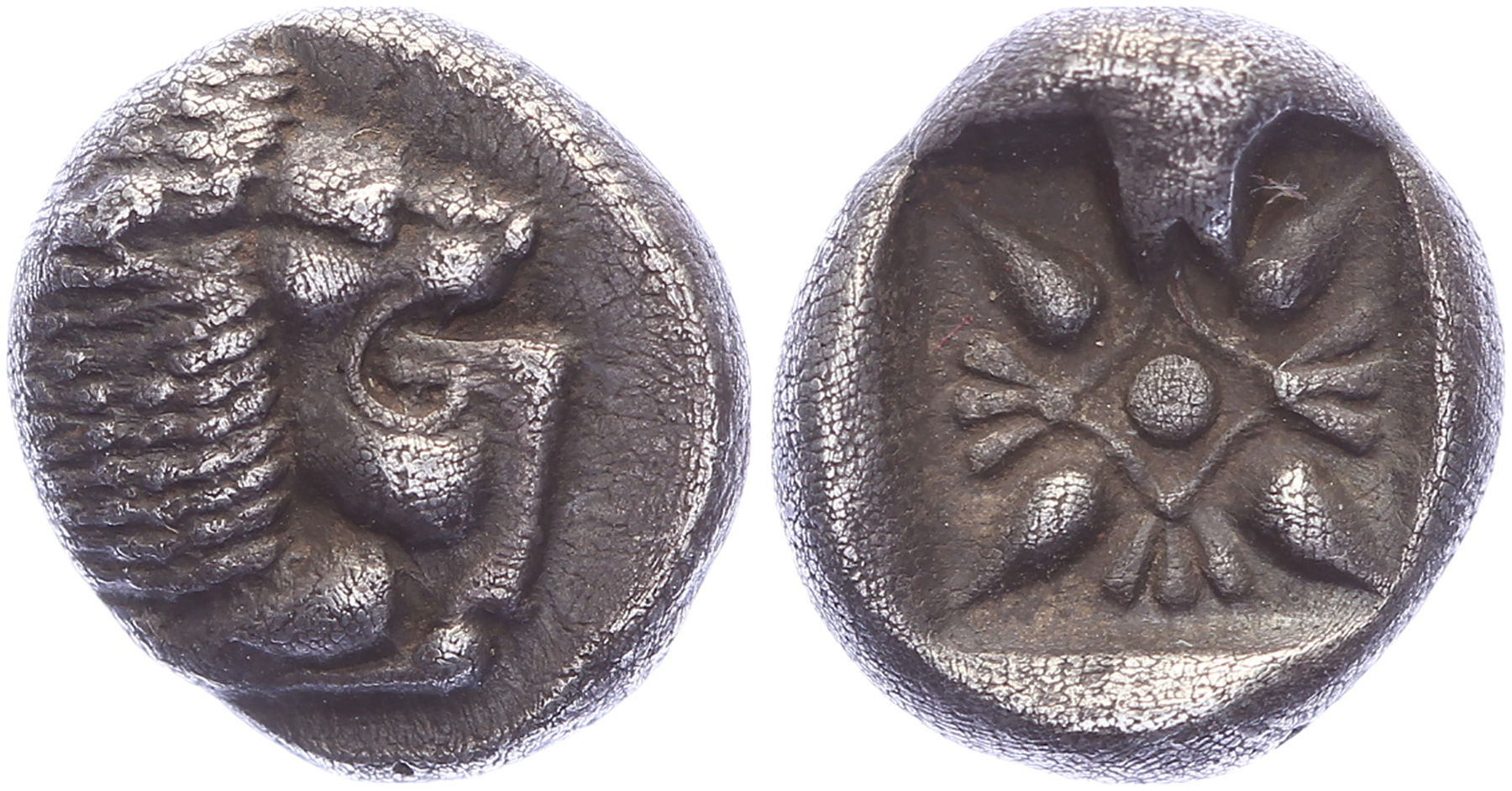 Late 6th-early 5th century BC. AR Diobol / 1/12th Stater [1,17 gm, 9,1 mm]. Lion›s torso and foreleg right, but head with open mouth turned back left / Stellate pattern within incuse square. SNG Kayhan 468-75. Granular surfaces, toned gVF.
