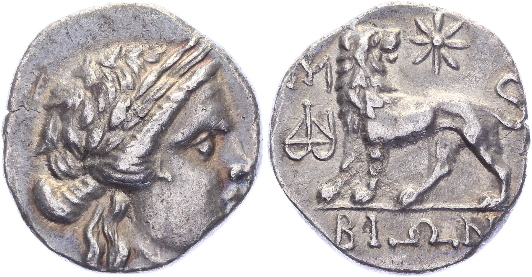 Circa 225-190 BC. AR Drachm [4,77 gm, 16,9 mm]. Bion, magistrate. Laureate head of Apollo right / BIΩΝ, lion standing left, head right; to left, monogram above MI; star above. Deppert-Lippitz 678 var. (monogram); Concordia Auc 11, lot 479 (same dies). Obverse a bit off centre, gVF.