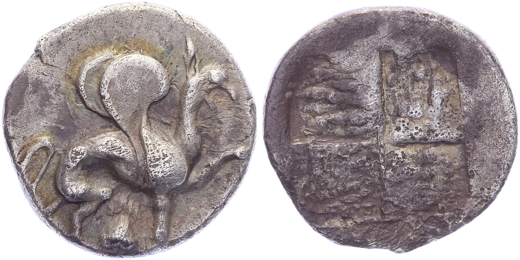 Circa 478-465 BC. AR Trihemiobol [1,31 gm, 12,3 mm]. Griffin with curled wings seated left, forepaw raised; apple(?) below / Quadripartite incuse square. Balcer 118 (same dies). Rare. VF.