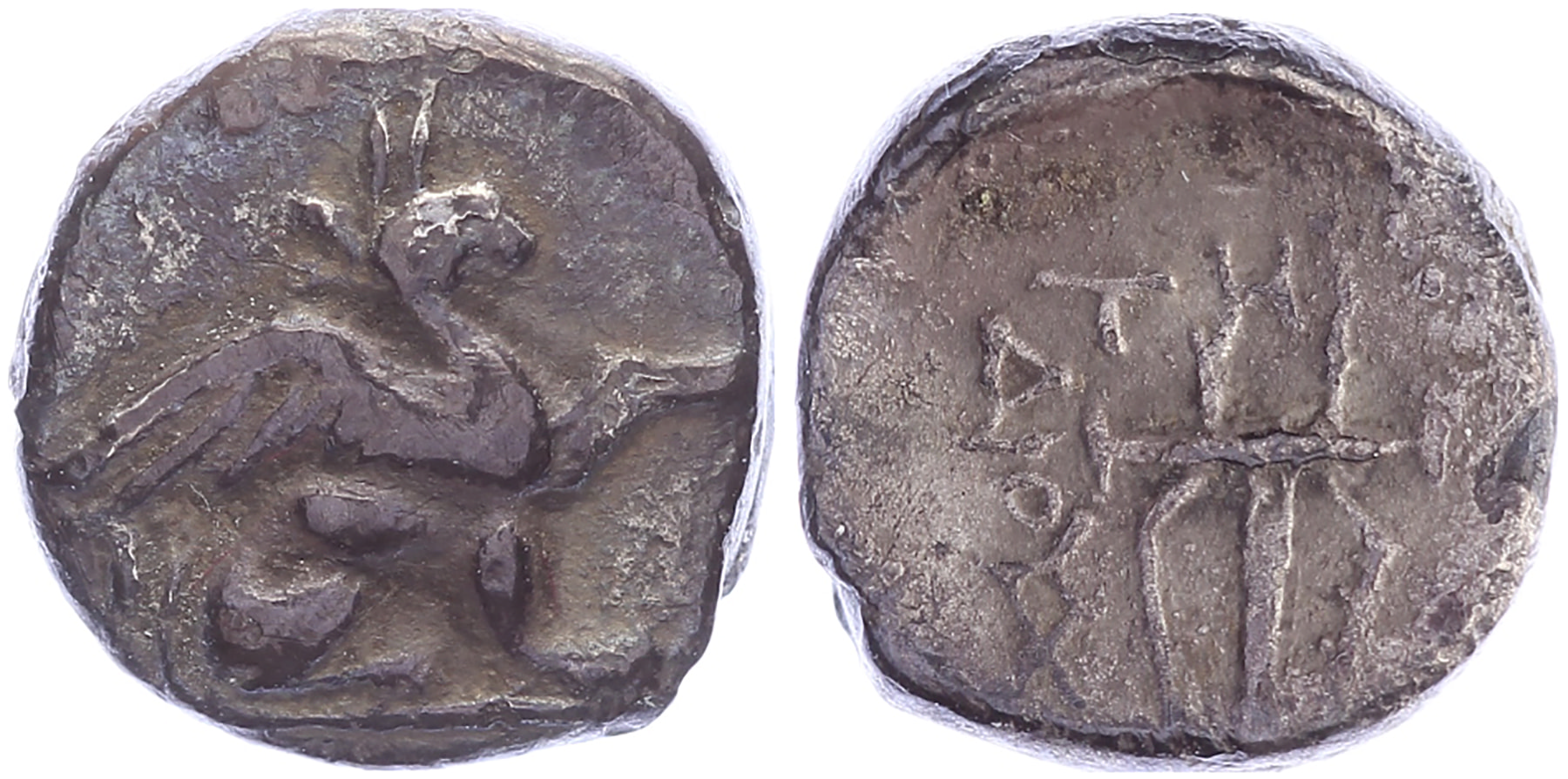 320-294 B.C. AR Diobol [0,81 gm, 8,4 mm]. Dioyches magistrate. Griffin seated right, left paw raised / THI / ΔIOYX[HΣ], Chelys (lyre), ethnic above, and magistrate’s name vertically downwards to right. SNG Kayhan.612v. Deeply toned, VF. Purchased from Tamco. februari 1997 (The Hague Holland coin fair)