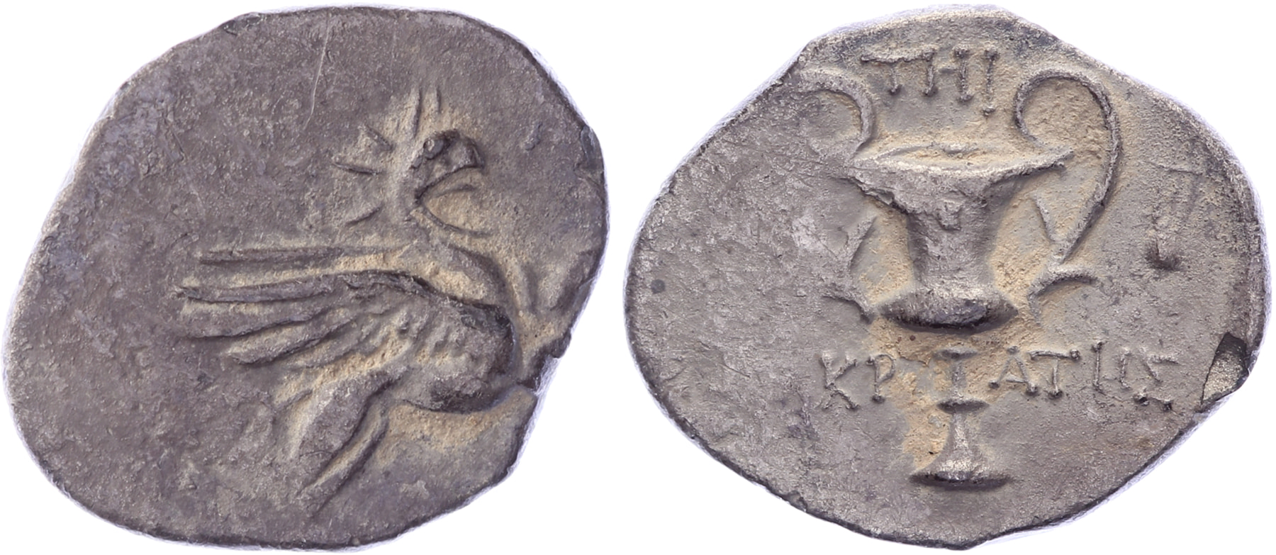 Circa 320-310 BC. AR Hemidrachm [1,48 gm, 14,2 mm]. Rhodian standard. Sokrates, magistrate. Griffin springing right / Kantharos; ΣΩKP-ATHΣ across field; to the right, lyre. Kinns 91; SNG von Aulock 2262. Toned as found, VF.