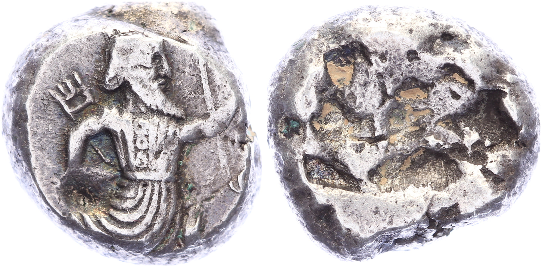 AR Siglos [5,64 gm, 14,3 mm]. Sardeis mint. Persian king in kneeling-running stance right, holding bow and dagger / Incuse square punch; countermark, astragalos within incuse square. Carradice Type IVA; GRPC S28; Klein 763; SNG Kayhan 1031. Toned VF.Purchased from Holleman, 1987