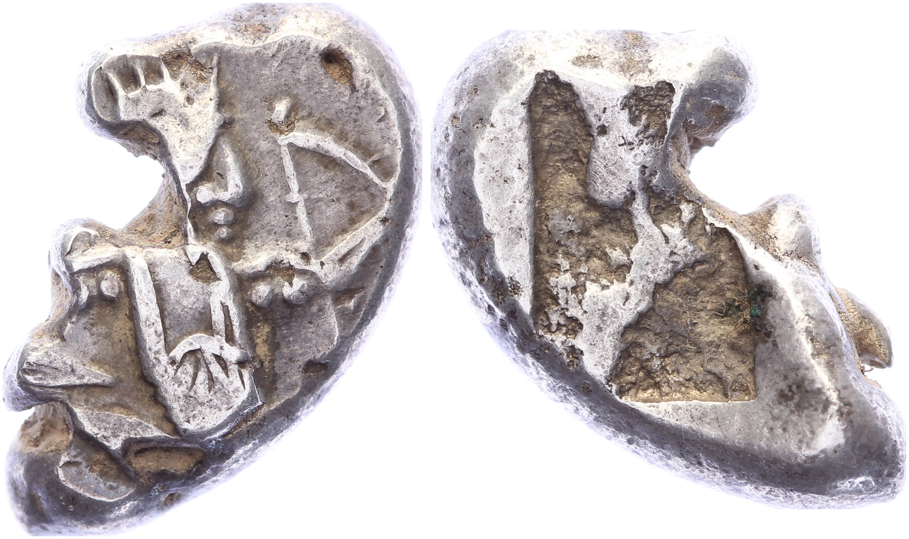 AR Siglos [5,46 gm, 15,8 mm]. Lydo-Milesian standard. Sardes or subsidiary mint. Persian king or hero, wearing kidaris and kandys, quiver over shoulder, in kneeling-running stance right, holding dagger in right hand, bow in left / Incuse punch. Carradice Type IV, Group B (pl. XIV, 43); BMC Arabia pl. XXVII, 10. Iregular flan, VF.Purchased from Tom Vossen, 2001