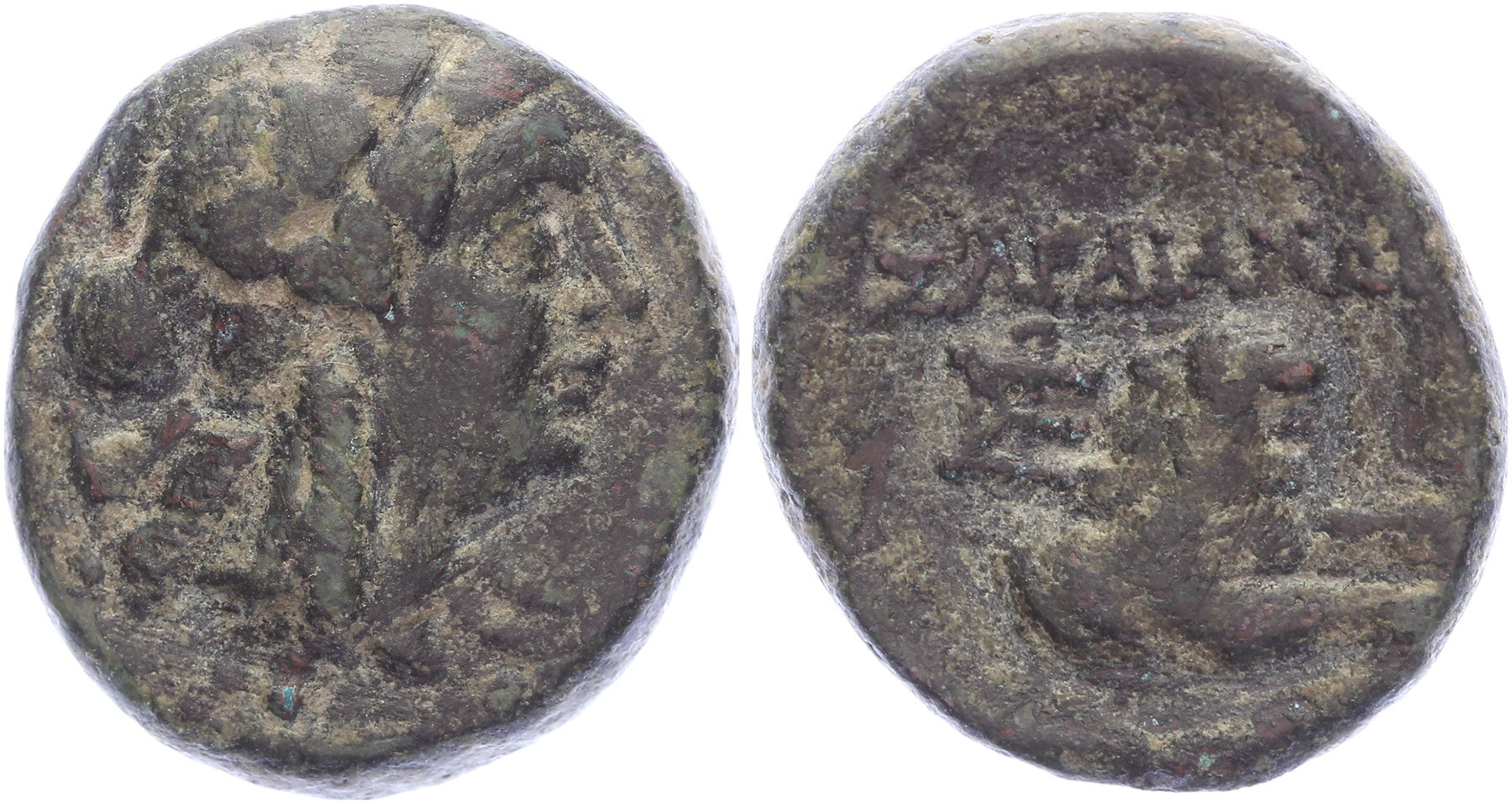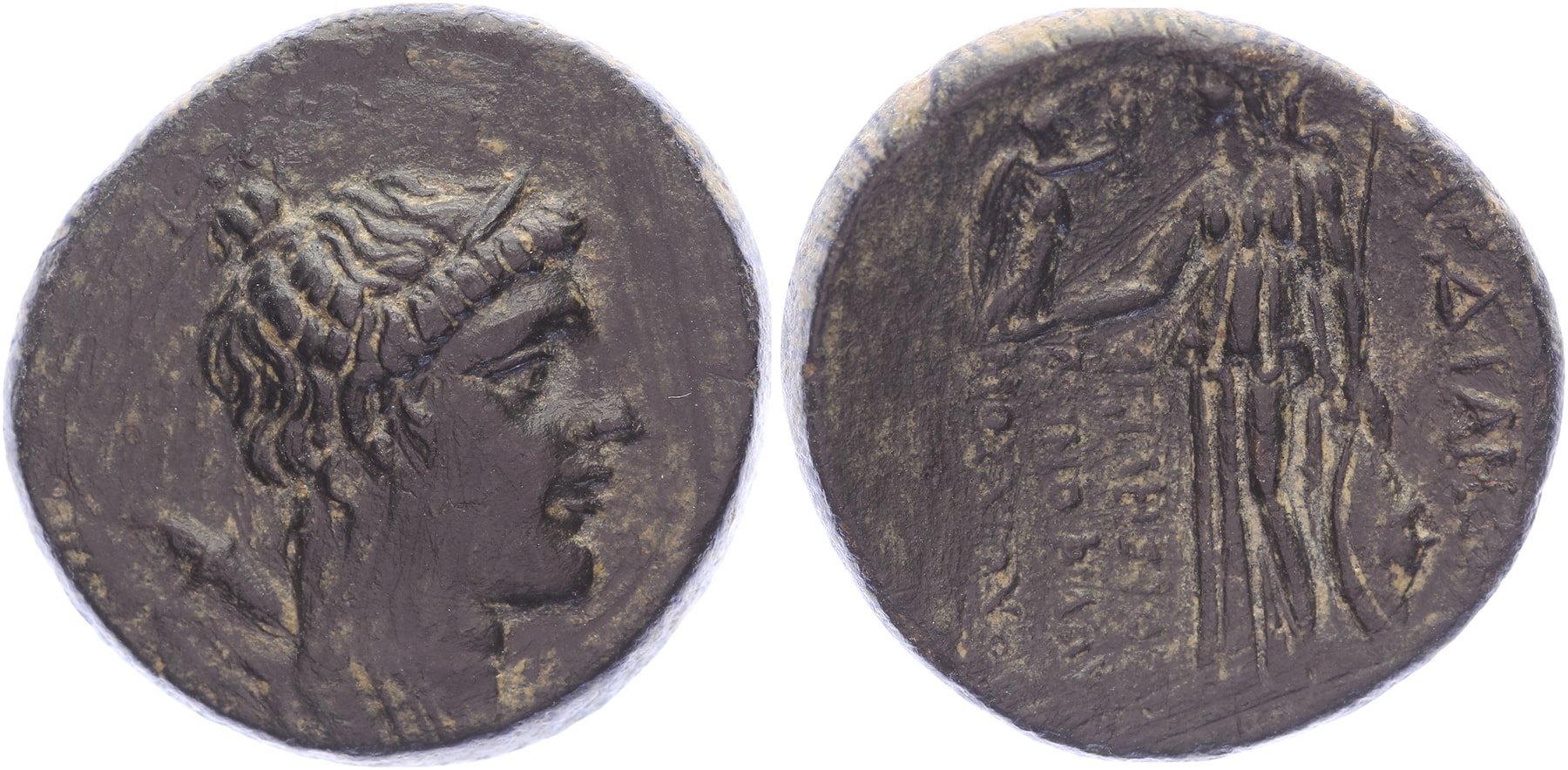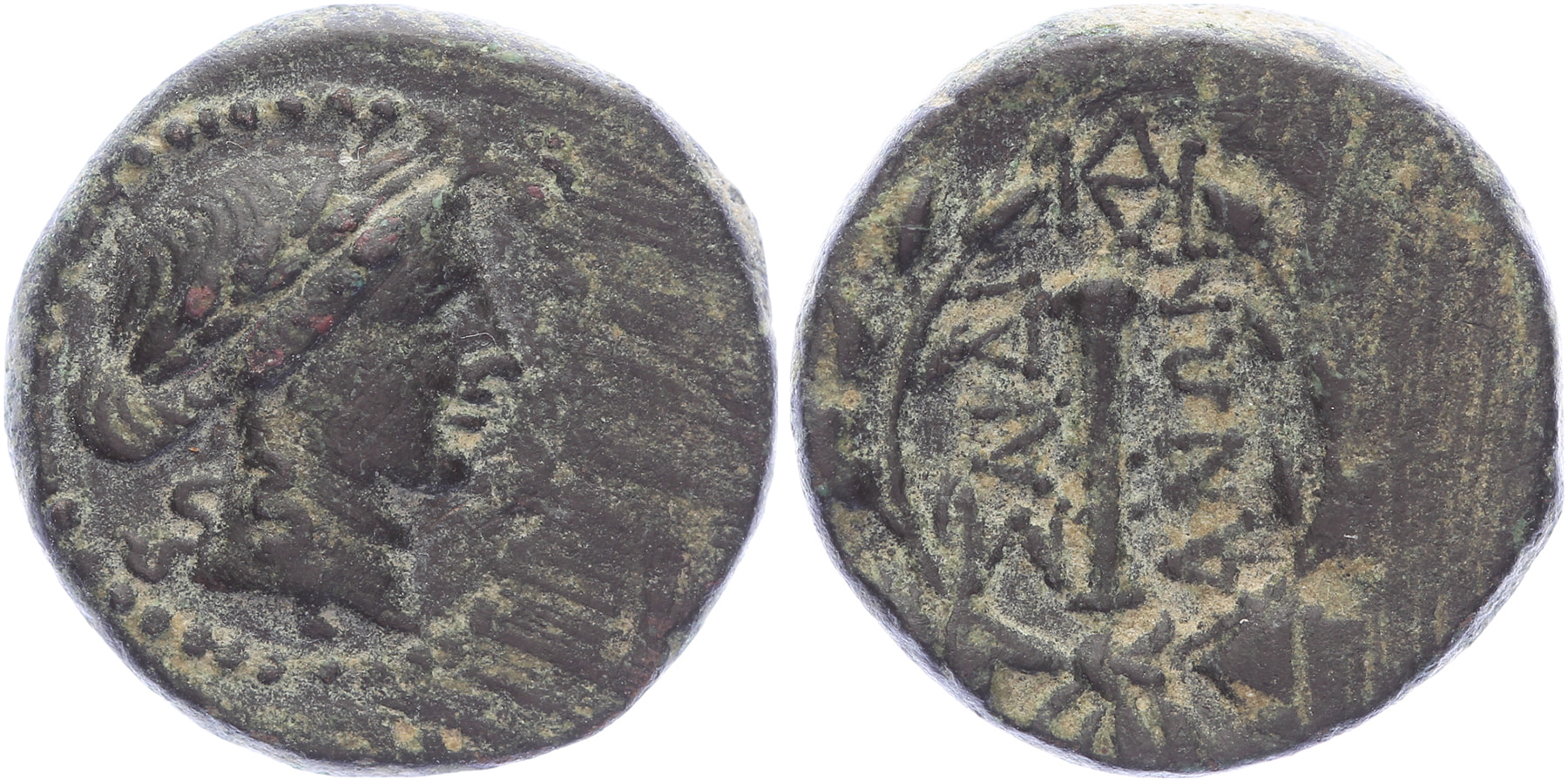 Lot (3) 2nd-1st Century BC. Æ [4,20 gm, 17 mm]. Laureate head of Apollo right / Club right within wreath. Kurth 9. Nice VF; Circa 133 BC-14 AD. Æ [7,74 gm, 22,1 mm]. Milesios, son of Demophilos Moschion), magistrate. Draped bust of Artemis right, with bow and quiver over shoulder / Athena standing left, holding crowning Nike with right hand and resting left hand upon shield, spear behind to right. BMC Lydia, 59; Bell, Sardis IX, 1, p.27, 263. Minor cleaning scratches, VF; Æ [4,40 gm, 15,7 mm]. Wreathed head of Dionysos right / Forepart of lion right. Kurth 182. aVF.Purchased from Tom Vossen, November 2003 (1, 3) & F. Javorscheck, June 1999 (2)