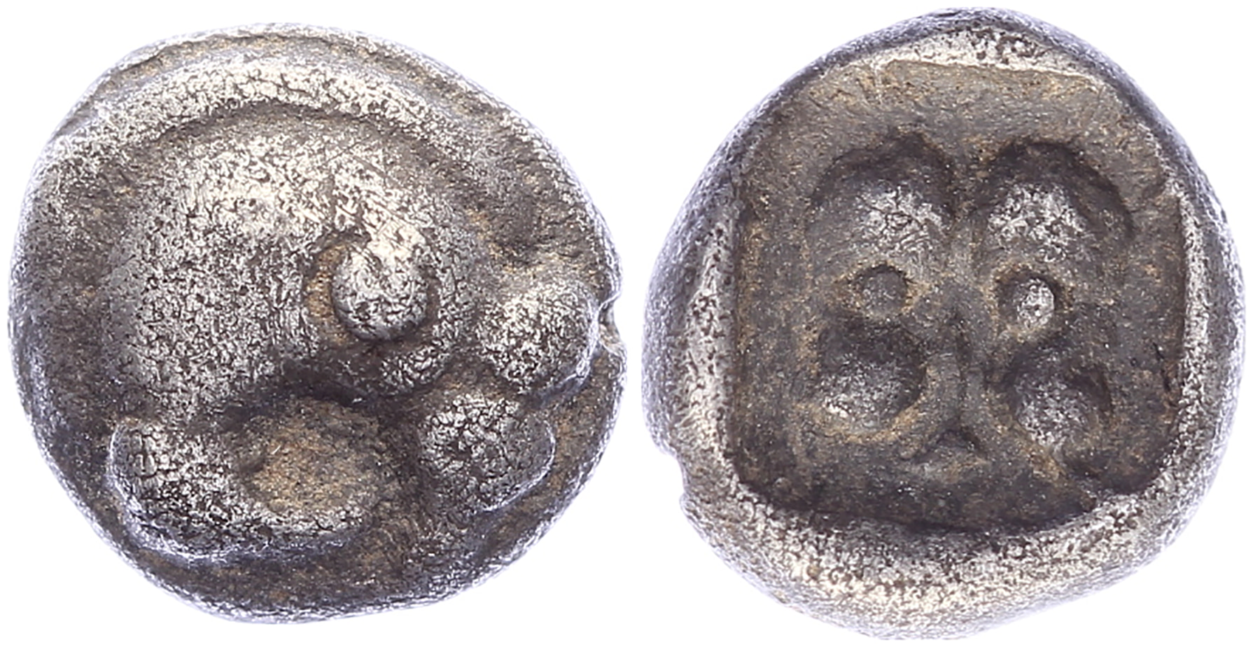 Circa 460-440 BC. AR Obol [0,66 gm, 7,7 gm]. Aeginetic standard. Head of griffin right / Facing head of lion within incuse square. W. Fischer-Bossert, “Ein karisches Monster” in Cista Mystica, 70; AsiaMinorCoins online #6419. VF.Purchased from Tom Vossen, November 2018, (#13227)
