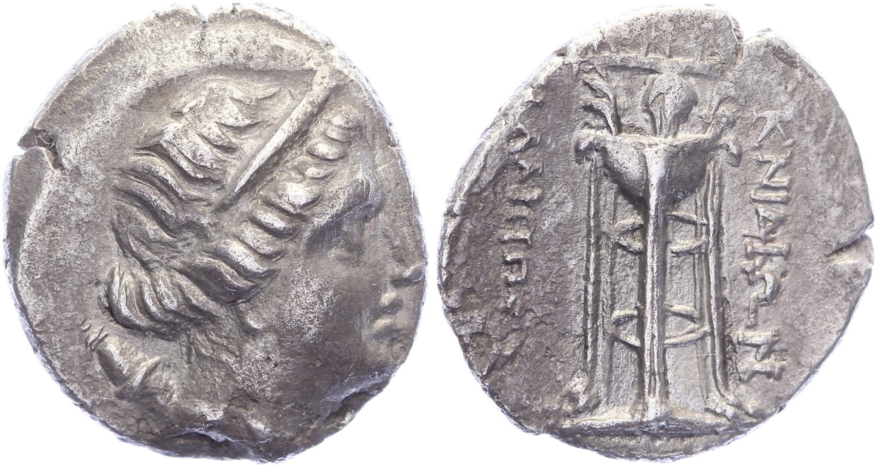 Circa 250-210 BC. AR Tetrobol [2,35 gm, 13,9 mm]. Kallippos, magistrate. Head of Artemis to right, quiver behind / Tripod; ΚNIΔIΩN to right, ΚAΛΛIΠΠOΣ to left. SNG Keckman 195. Toned VF.Purchased from Tom Vossen, April 2004