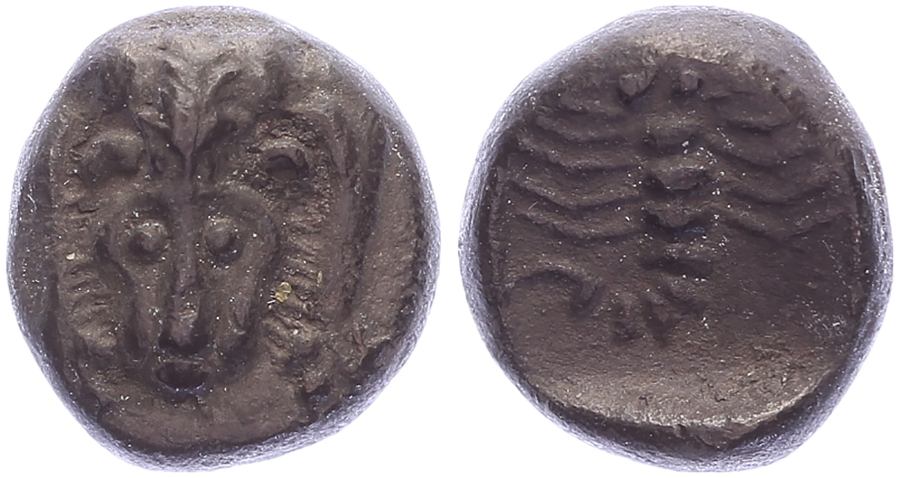 Circa 450-400 BC. AR Obol [0,49 gm, 6,7 mm]. Facing forepart of lion / Scorpion, tail to right. SNG Kayhan 934; SNG Copenhagen 379 (Uncertain Coins of Asia Minor); SNG von Aulock 7803. Deeply toned, find patina, gVF.