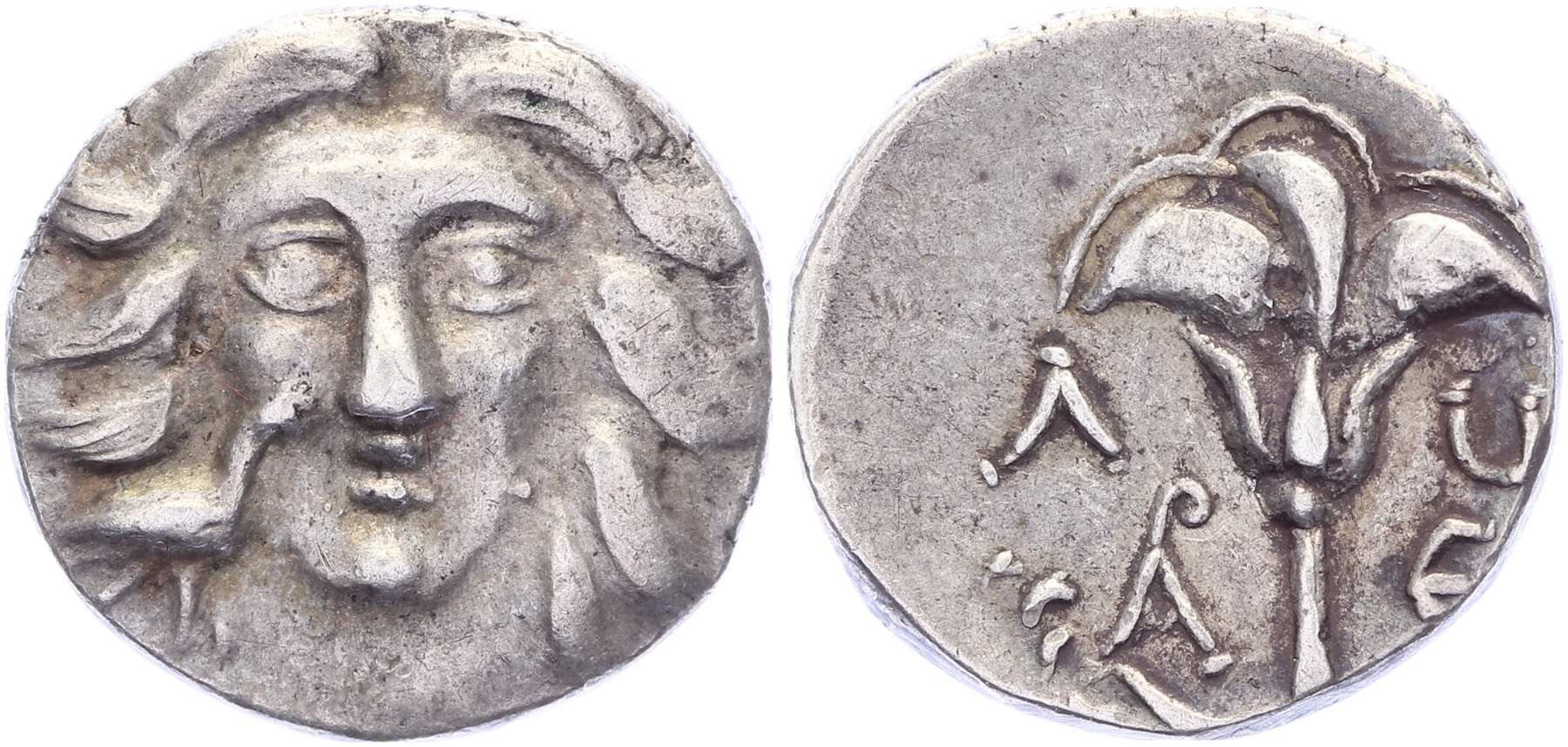 Early-mid 2nd century BC. AR Drachm [1,92 gm, 14,2 mm]. Pseudo-Rhodian type. Head of Helios facing; bird at cheek to left / Rose with buds to left and right; Λ-ω / (AP monogram)-Є in two lines, flanking stem. Ashton, Mylasa 305 (A103/P241). Nice VF.