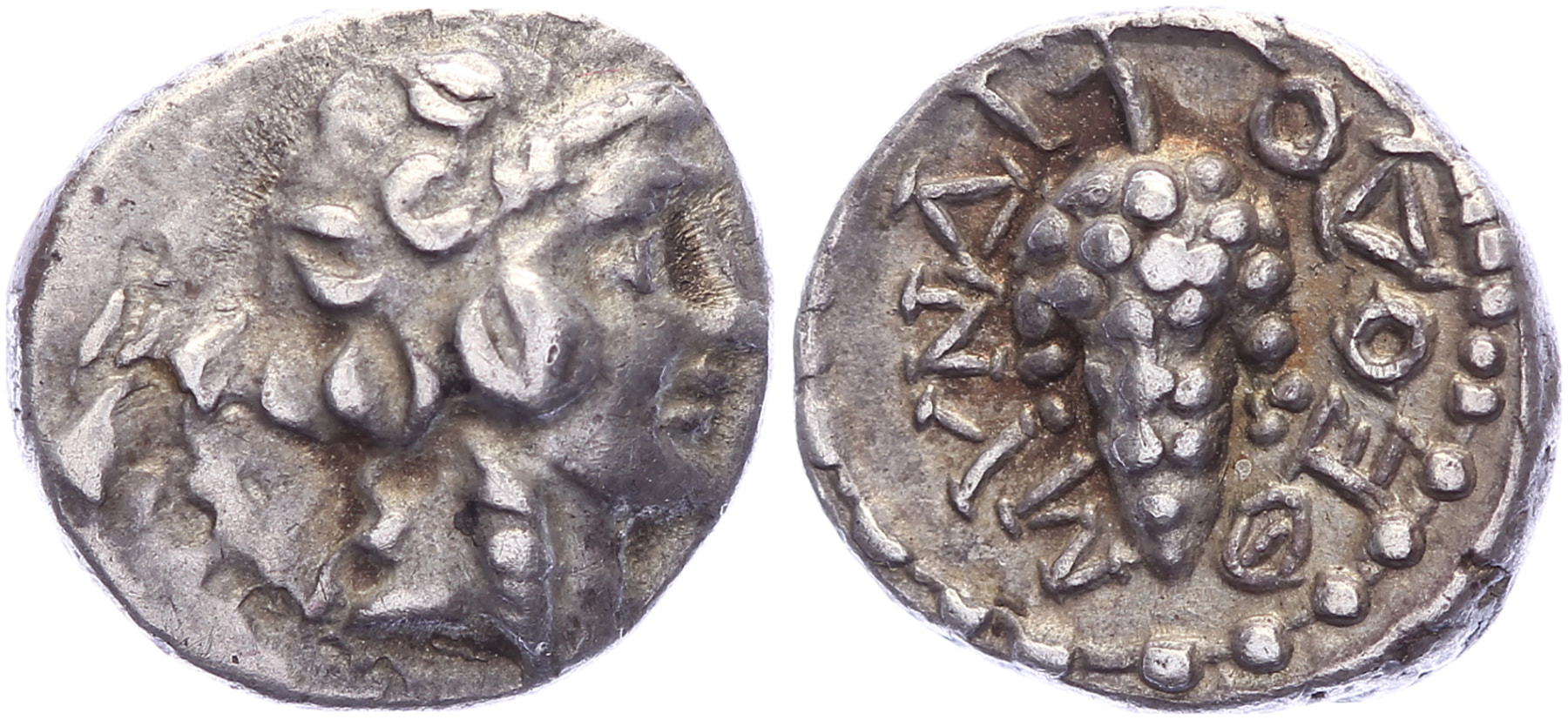 2nd-1st century BC. AR Hemidrachm [1,16 gm, 10,9 mm]. Head of young Dionysos right wreathed in ivy / MYNΔI ΘEOΔO, around bunch of grapes. BMC 14. Rare. Toned VF.Purchased from Mr. van de Brul, April 2001 (Berkel Enschot coin fair)