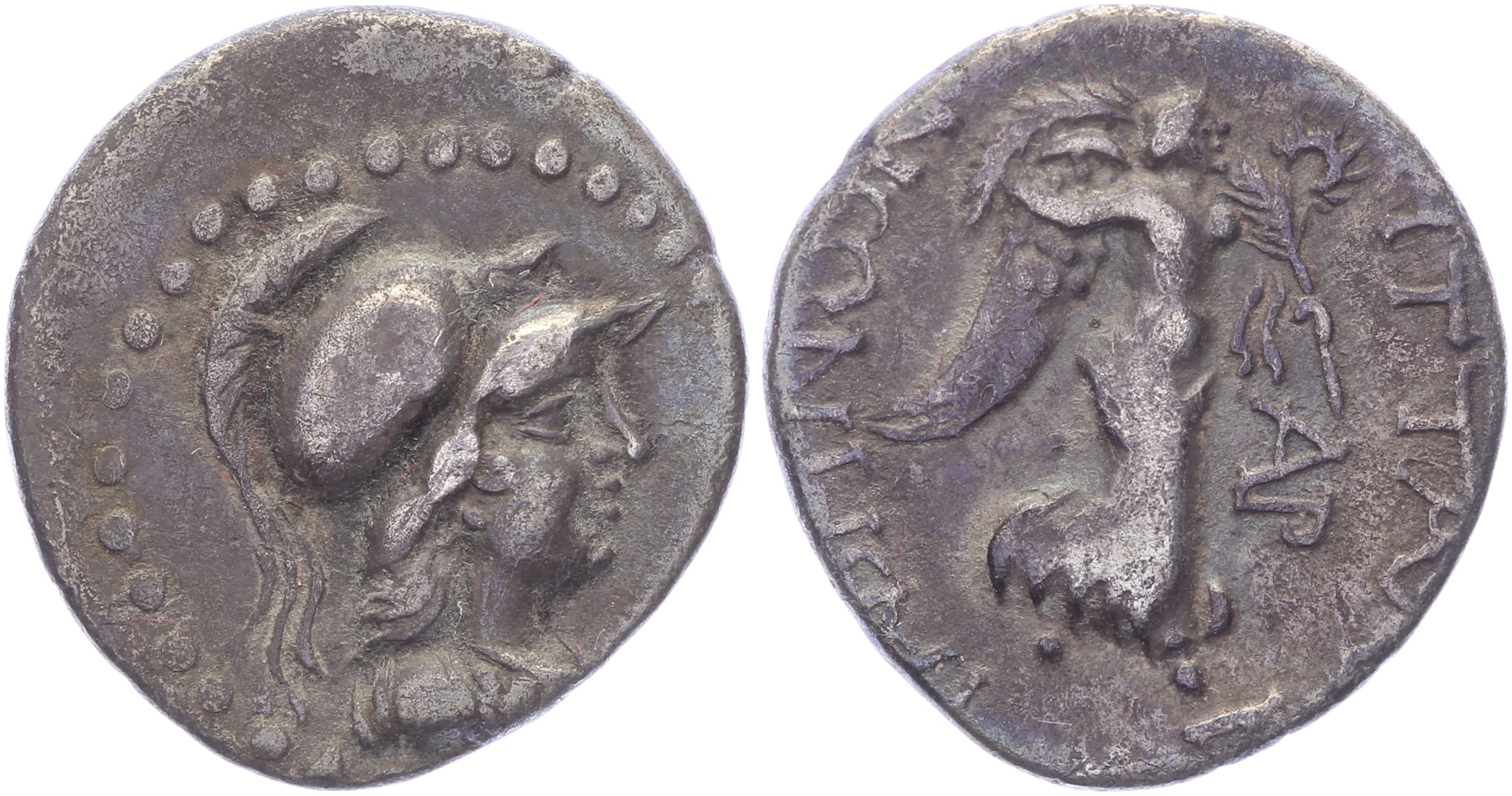 Circa 80-50 BC. AR Hemidrachm [1,81 gm, 15,1 mm]. Attalos magistrate. Helmeted and draped bust of Athena right / TABHNΩN / ATTAΛOΣ / AP, Nike advancing right, holding wreath and palm frond. SNG Keckman 267 (same dies). Rare. Toned VF.Purchased from Tom Vossen, May 2001 (Leuven coin fair)