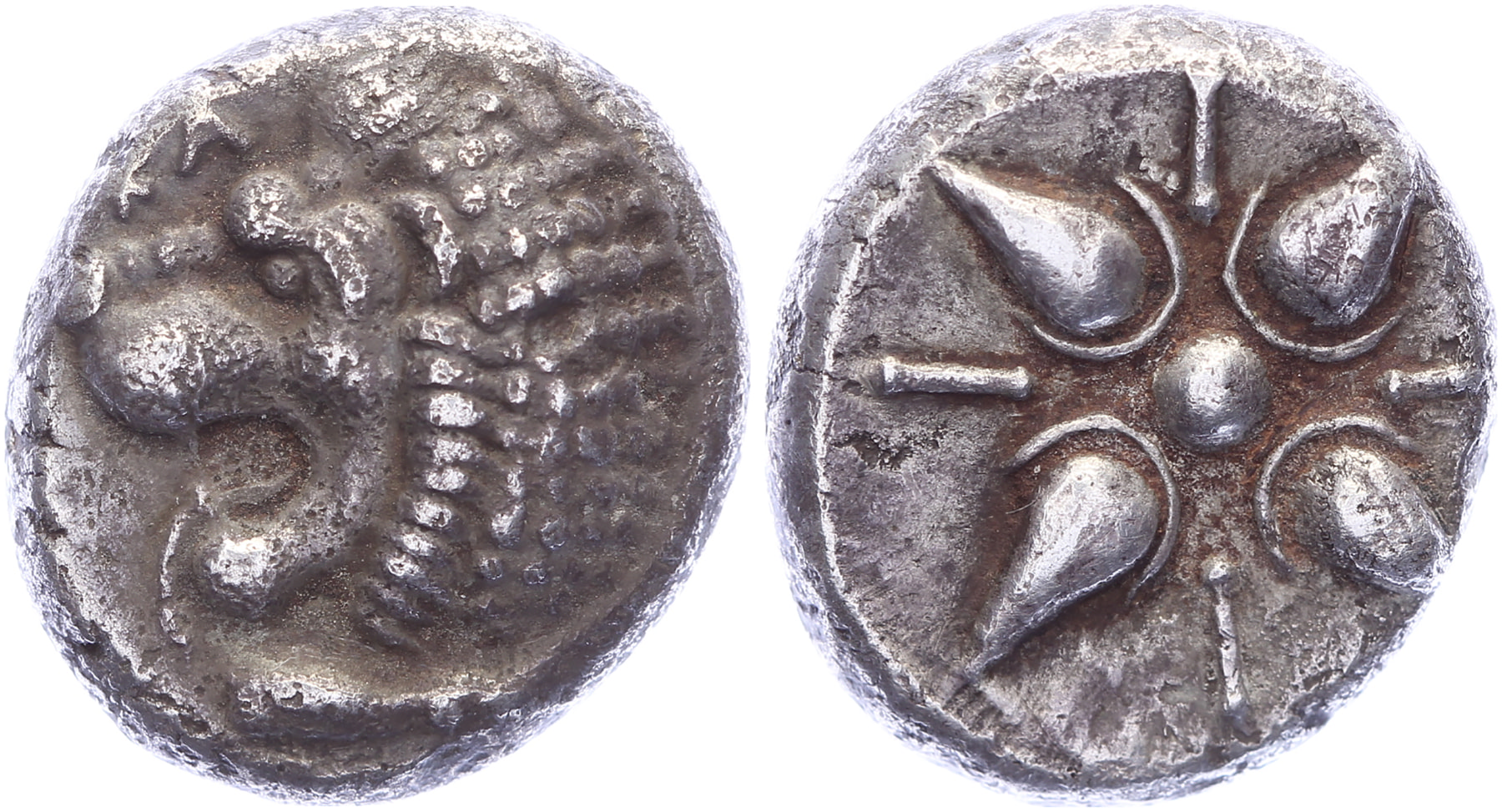 AR Drachm [4,17 gm, 13,2 mm]. Forepart of roaring lion left; [E]KA above / Stellate pattern. Traité pl. LXXXIX, 19; SNG Kayhan 862; SNG von Aulock 2356; SNG Copenhagen 588. Lighty toned VF.Purchased from Tom Vossen, March 2001