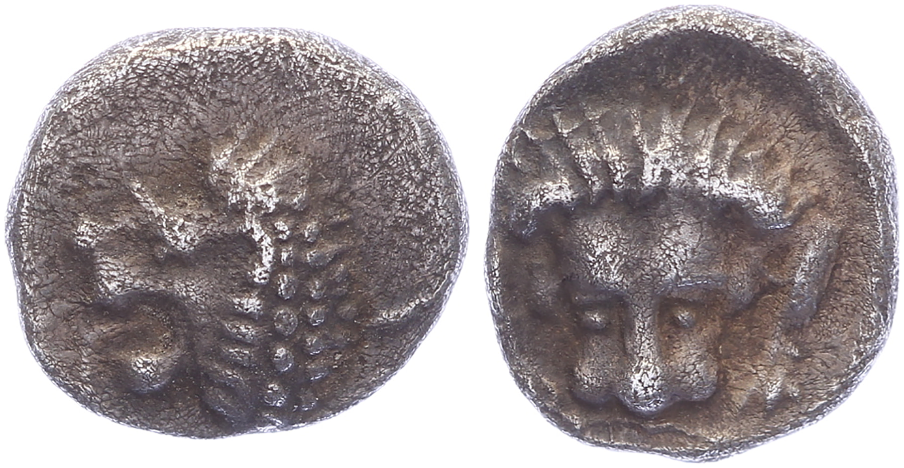 AR Hemiobol (0.46g, 7.5mm). Mylasa mint (?). Head of roaring lion left / Forepart of lion facing, trident head below. SNG Tübingen 3310; Klein 506; SNG Keckman 837-840; SNG von Aulock 1819 (Miletos). VF.