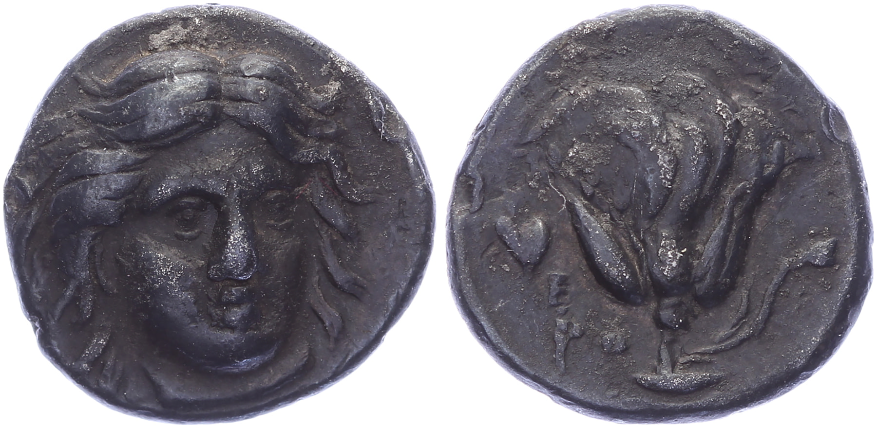 Circa 305-275 BC. AR Hemidrachm [1,68 gm, 12,1 mm]. Facing head of Helios, turned slightly right, hair parted in center and swept to either side / Rose with single bud on tendril to right; ivy leaf and E above PO to left. SNG Keckman 464-6. Dark find patina, VF.Purchased from Tom Vossen, November 2002