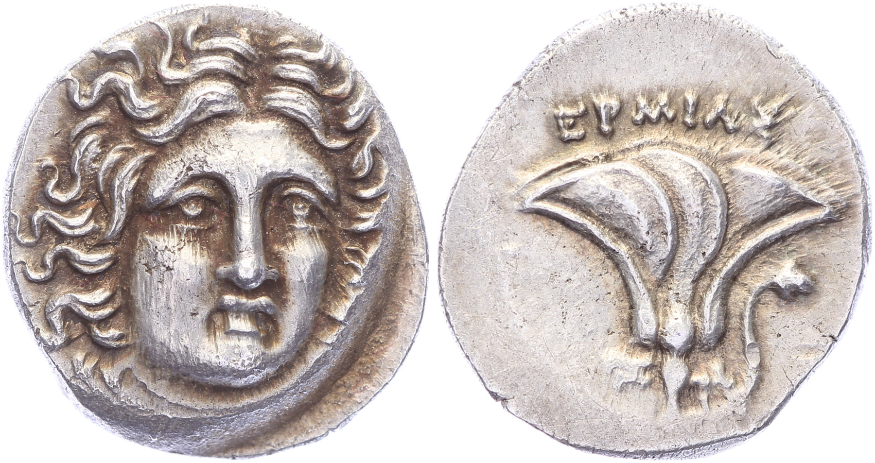 Circa 172-168 BC. AR Drachm [2,44 gm, 13,8 mm]. Hermias, magistrate. Head of Helios facing slightly right / Rose; I-W flanking stem, ERMIAS above. Price, Larissa pg. 241; SNG Helsinki 795. EF.