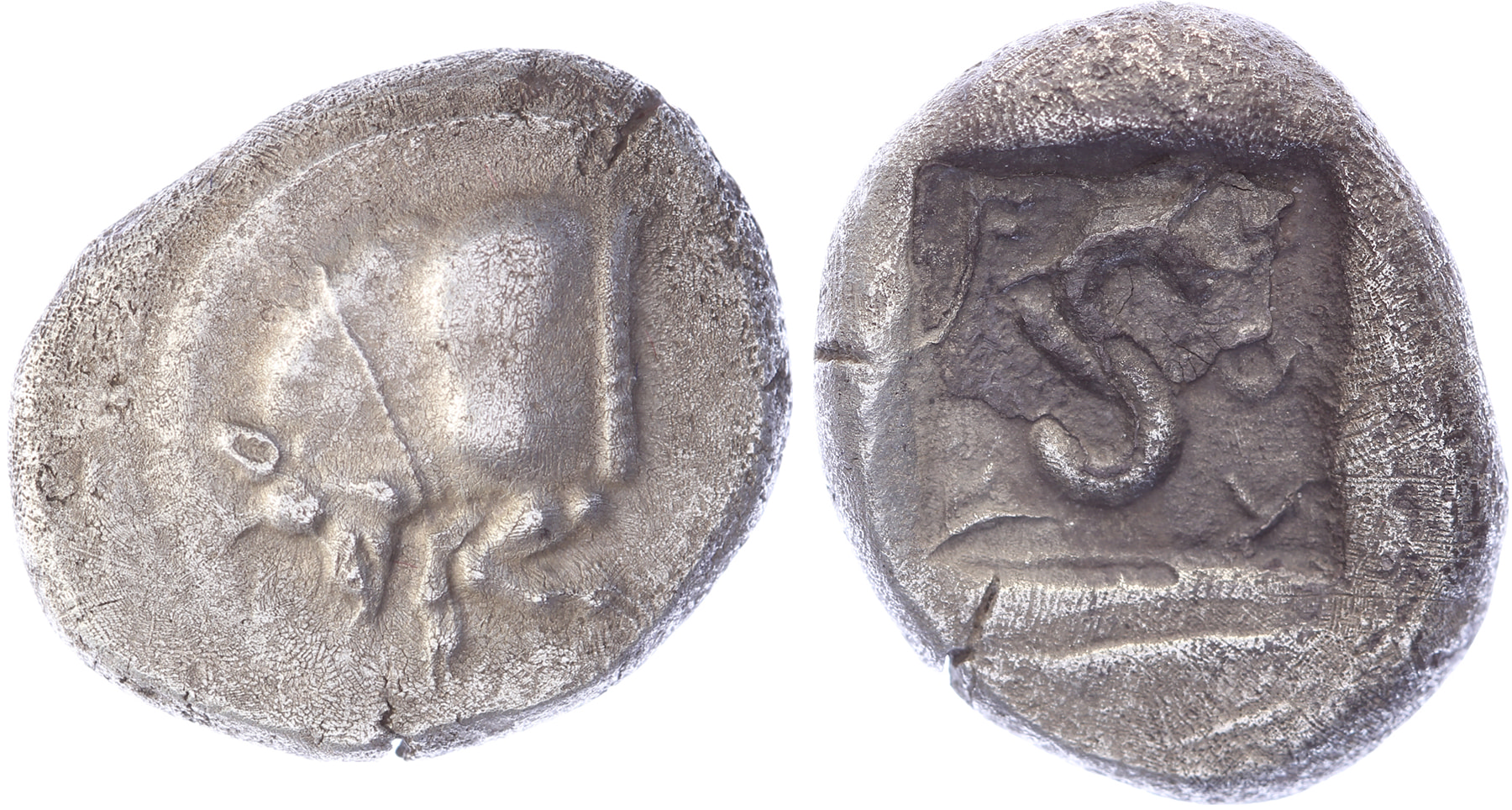 Uteves. Circa 480 BC. AR Stater [7,96 gm, 20,1 mm]. Forepart of a boar left / Diskeles with a small appendage protruding from side; all within an incuse square. Traité pl. 93, 13; Babelon, Les Perses, 467, pl. 12, 6. Granular surfaces, reverse deposits, VF.Purchased from Tom Vossen, November 2004 (Tienen coin fair)