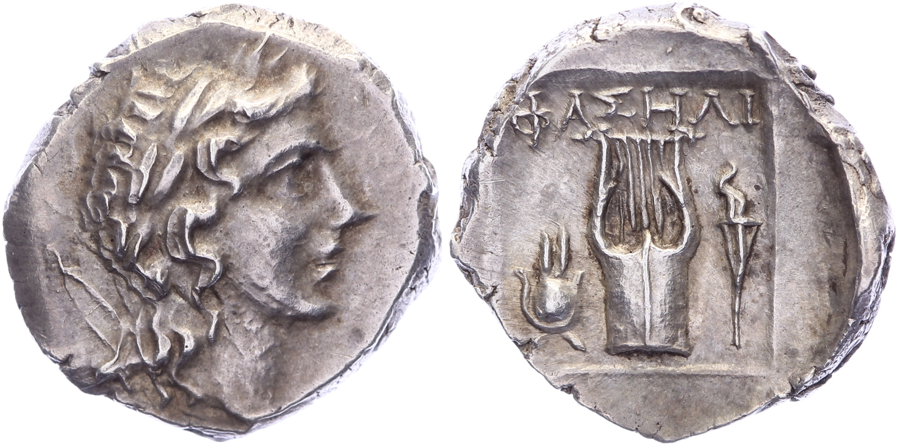 Circa 167-100 BC. AR Hemidrachm [2,51 gm, 15,4 mm]. Phaselis mint. Laureate head of Apollo right / ΦAΣHΛI, lyre; Isis crown to left, torch to right; all within rectangular incuse . Troxell, Lycian Period II, Series 1, 47; SNG von Aulock 4438. Worn obverse die, otherwise aEF.