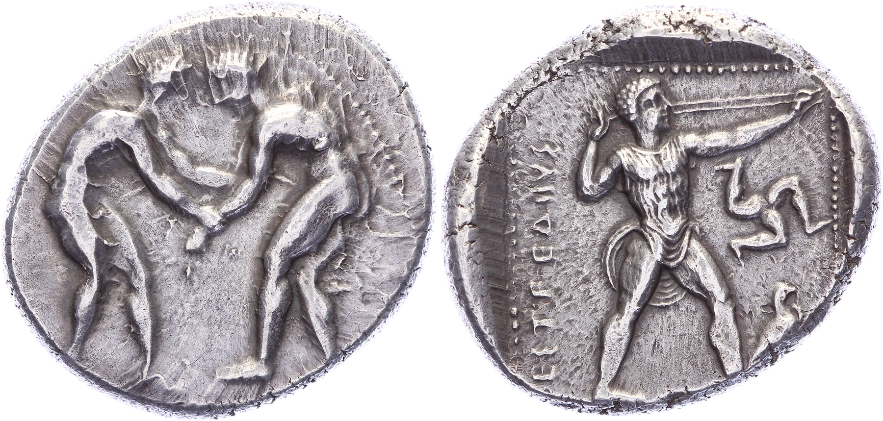 Circa 380-325 BC. AR Stater [10,84 gm, 24,3 mm]. Two wrestlers grappling; all within pelleted circle / EΣTFEΔIIYΣ, slinger in throwing stance to right; to left, triskeles above eagle to right; all within pelleted square. Tekin Series 4; SNG BN 78; SNG von Aulock 4519; SNG Copenhagen 206-8.  Worn obverse die, gVF. Purchased from Veiling Rietdijk, Auc 369 lot 849, June 2000