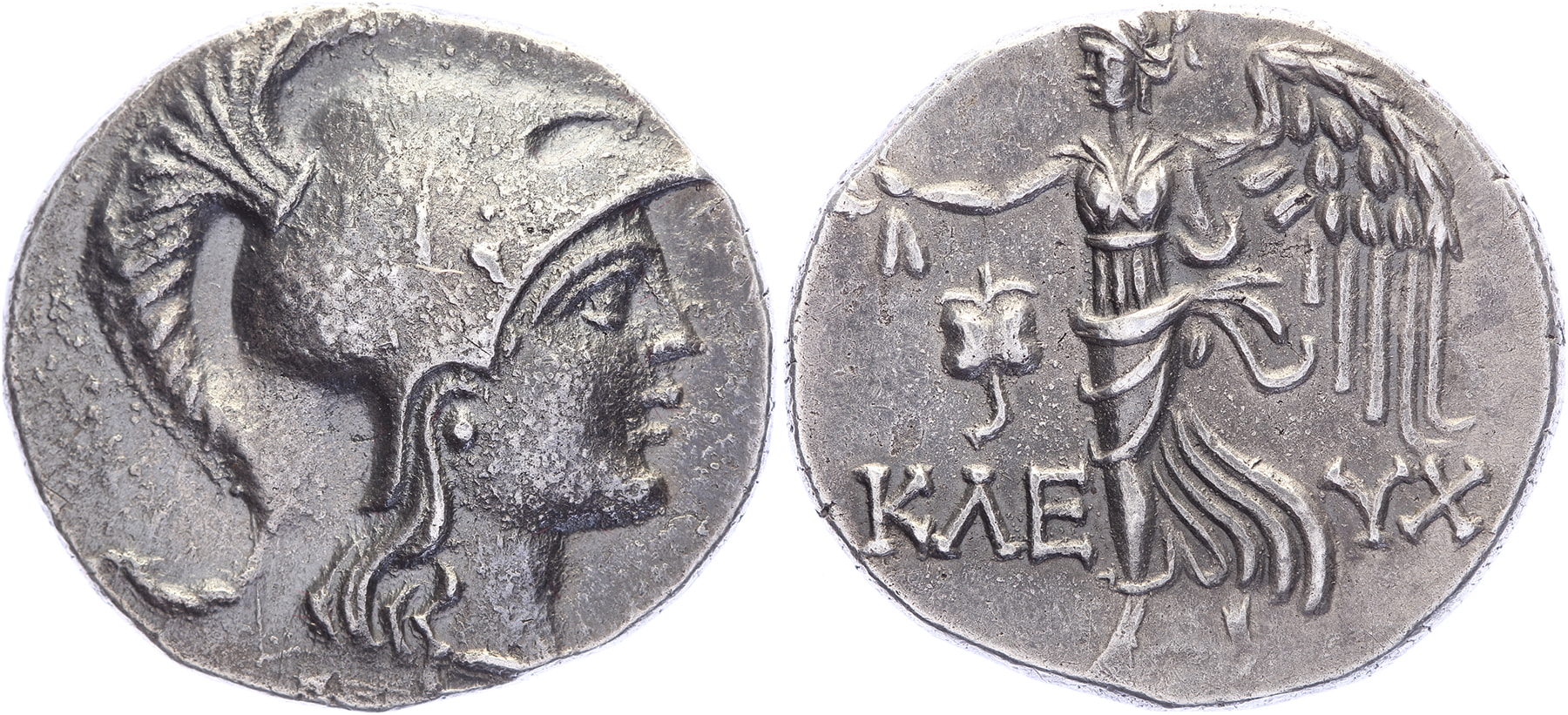 Circa 200-190 BC. AR Tetradrachm [16,08 gm, 29,8 mm]. Kleuch–, magistrate. Head of Athena right, wearing crested Corinthian helmet. / Nike advancing left, holding wreath; pomegranate above KΛE-YX (magistrate) in left field. SNG BN Paris 696; SNG von Aulock 4797. Rusty dies, toned gVF. Purchased from J. van Loon, November 1995, Auction 50, lot 19