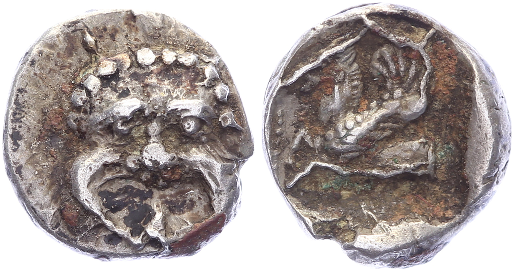 Circa 410-375 BC. AR Obol [0,71 gm, 8,6 mm]. Facing gorgoneion / Forepart of Pegasos left with dotted square within incuse square. Casabonne type 4. SNG Levante 247 var. [Pegasos right]. SNG BN Paris 113. VF.Purchased from W. van Alsenoy, March 2000 (Antwerpen coin fair)