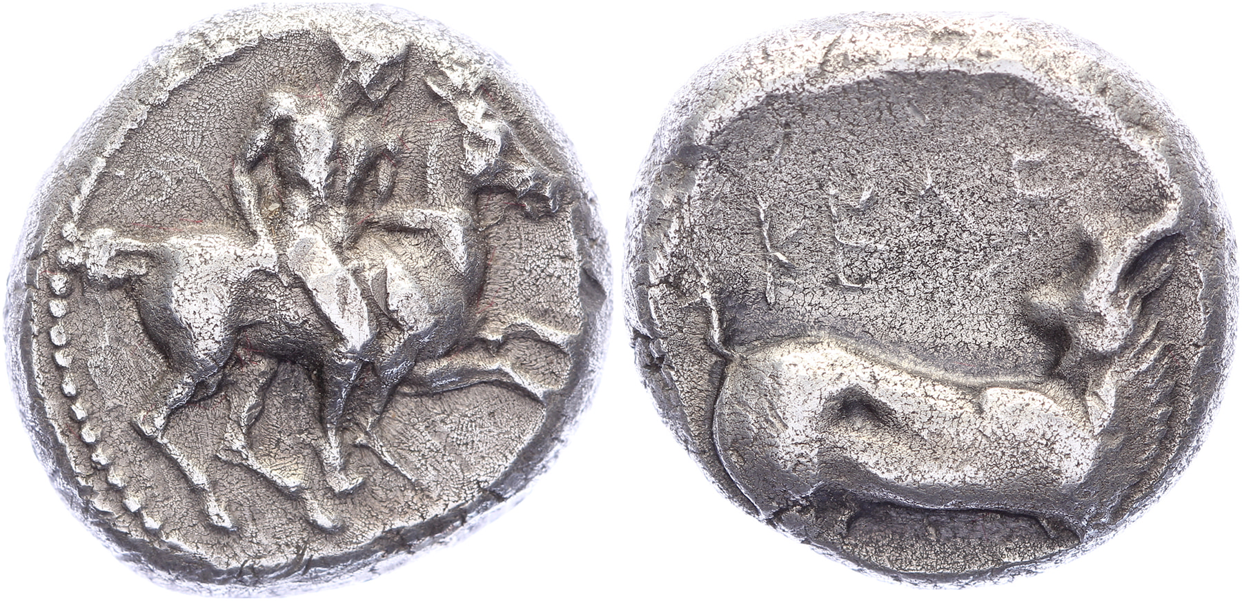 Circa 410-375 BC. AR Stater [10,18 gm, 19,5 mm]. Nude youth, holding whip, dismounting from horse rearing right / Goat kneeling right, head left. Casabonne Type 4; SNG BN Paris 69-70 var. (ethnic). Granular surfaces, worn reverse die, VF.