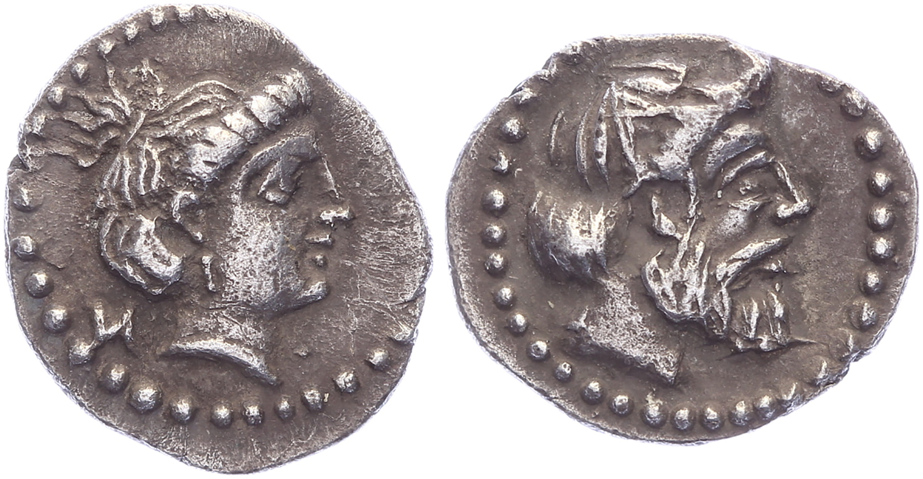 Circa 400-380 BC. AR Obol [0,77 gm, 9,9 mm]. Head of Aphrodite right; behind, N / Bearded head of Dionysos right. SNG BN Paris 14. Toned gVF.Purchased from Gert Boersema, September 2019