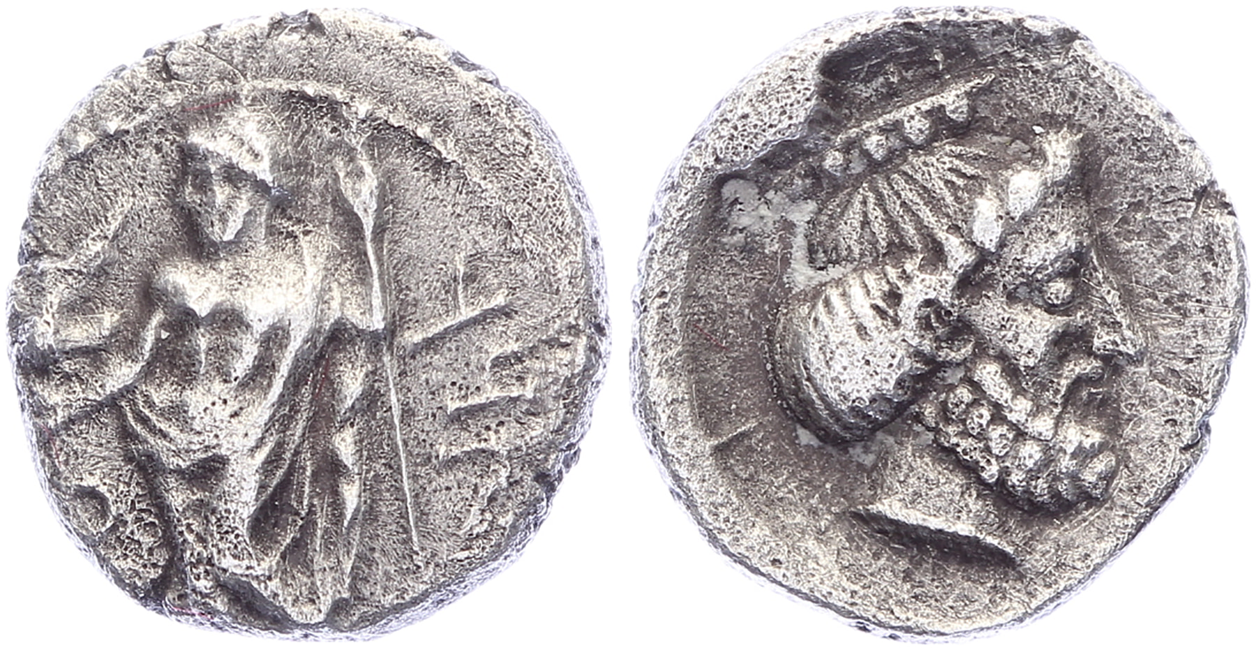 Tiribazos, satrap of Lydia. 388-380 BC AR Obol [0,75 gm, 9,2 mm]. ‘tri’ in Aramaic, Baaltars standing front, head to left, holding eagle in his right hand and long scepter in his left; to left, monogram / Head of Ahura-Mazda to right, wearing crown. SNG Levante 216. SNG BN Paris 234. A bit porous, VF.Purchased from Tom Vossen, Spring 2005 (#1635)