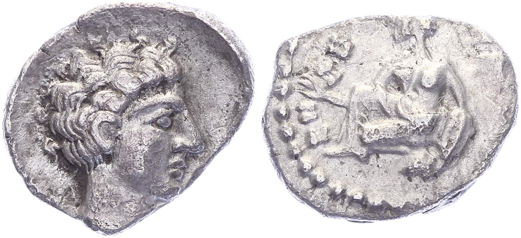 Circa 370 BC. AR Obol [0,60 gm, 9,6 mm]. Female kneeling left, casting astragaloi / Youthful male head right. SNG Levante 65; SNG BN Paris 239. VF.