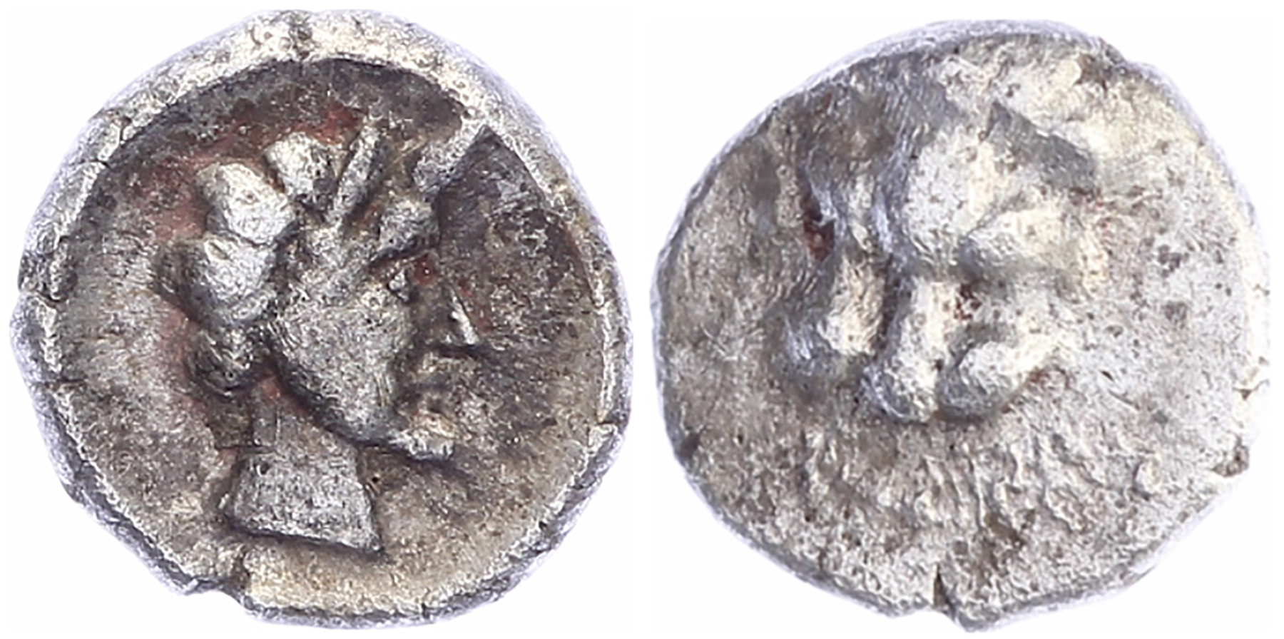 Early-mid 4th century BC. AR Tetartemorion [0,19 gm, 5,7 mm]. Facing lion’s head / Bearded head of satyr right within incuse circle. Troxell & Kagan 8. VF.