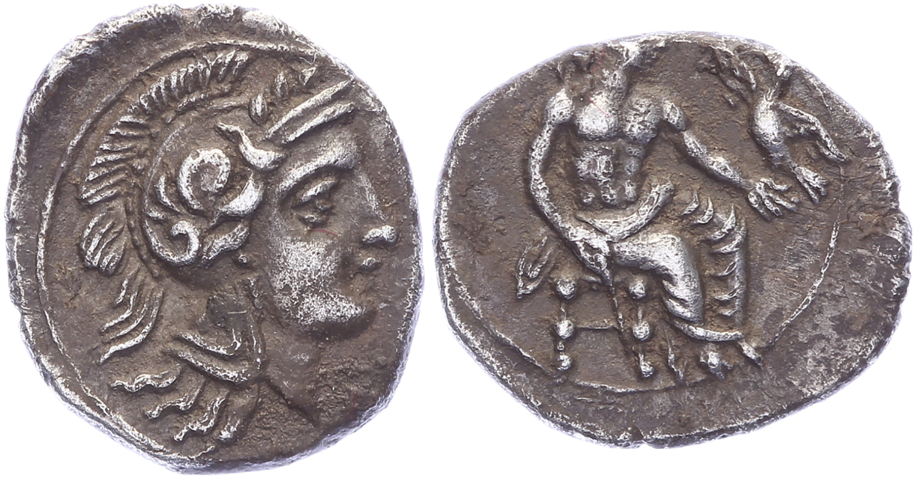 4th century BC. AR Obol [0,82 gm, 9,7 mm]. Helmeted head of Athena right / Baaltars seated right on throne, holding eagle and sceptre. SNG Levante 244. Reverse off centre, toned gVF.Purchased from Tom Vossen, Spring 2005