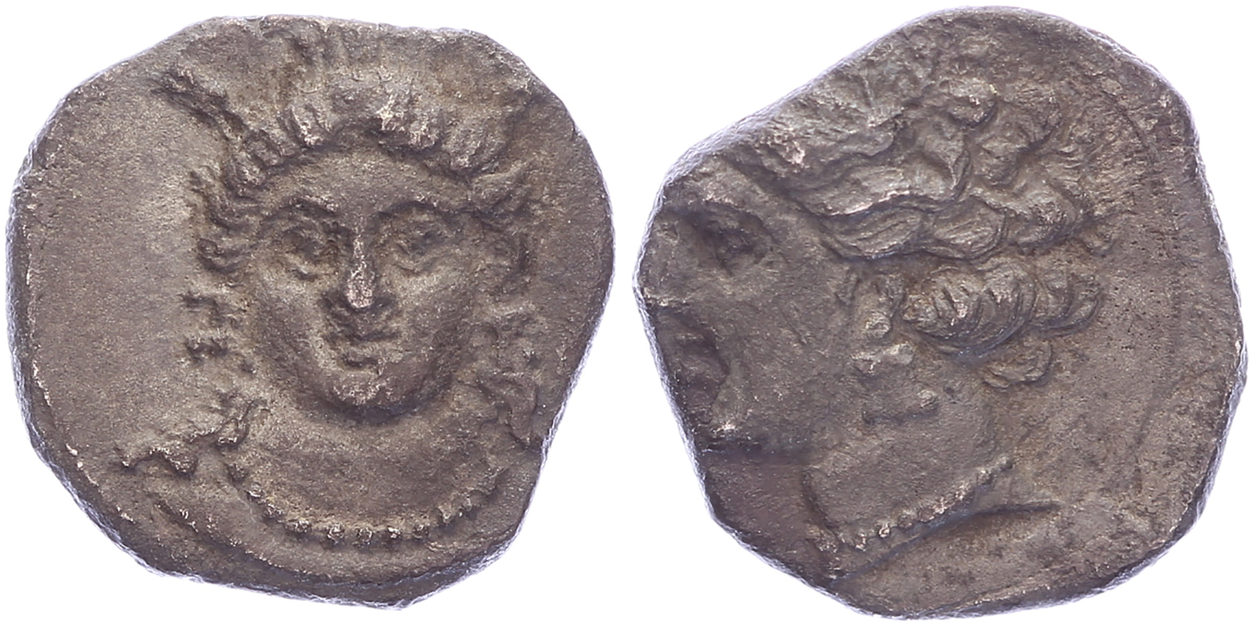 Circa 4th century BC. AR Obol [0,74 gm, 9,8 mm]. Three-quarter facing female head, head turned slightly left, wearing tall stephane decorated with palmette / Head of Aphrodite left. SNG Levante 243. Deeply toned VF.