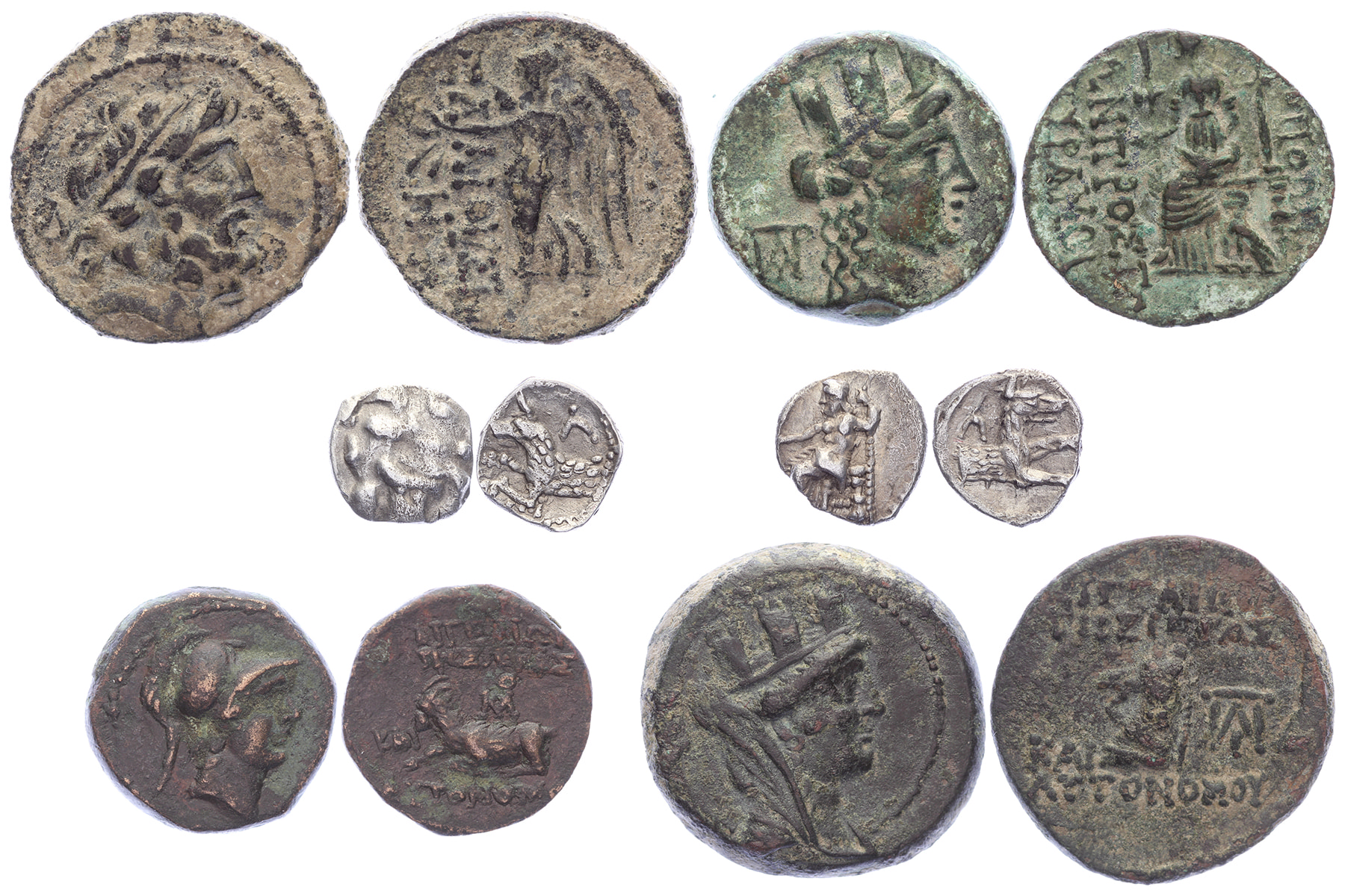 Lot (6) Cilicia m.b.t. munten uit de regio’s Aigeai, Elaiussa Sebaste & Hierapolis-Kastabala. Diverse jaartallen en kwaliteiten. Toegevoegd: LYKAONIA, Laranda - 2 x AR Obol [0,59 gm, 10 mm]; [0,50 gm, 10,1 mm].Uitgebreide beschrijving van de munten bij lot ingesloten. / Comprehensive description accompanies this lot.