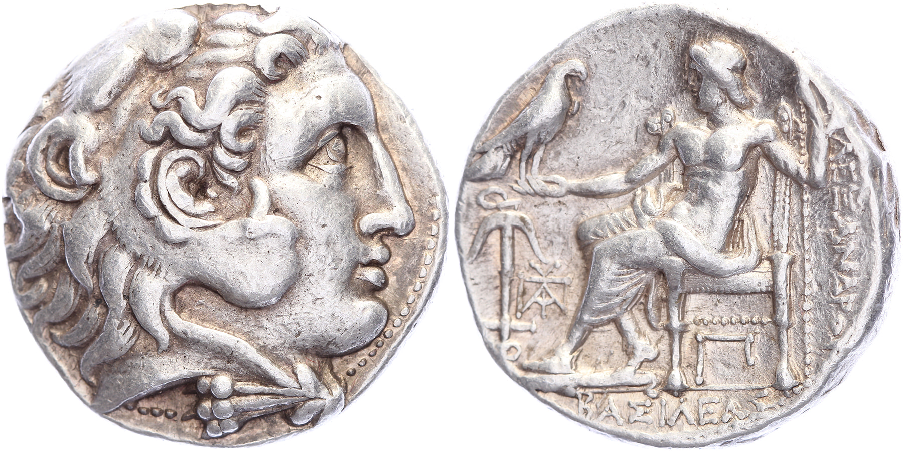 AR Tetradrachm [17,05 gm, 26,1 mm]. Babylon II mint. Struck in the name of Alexander III of Macedon, circa 311-300 BC. Head of Herakles right, wearing lion skin / ΒAΣIΛEΩΣ - AΛEΞANΔPOY, Zeus Aëtophoros seated left; anchor and monogram in left field, Π below throne. SC 94.3d; Price 3349. gVF.Purchased from Tom Vossen, 2006 (#3682)