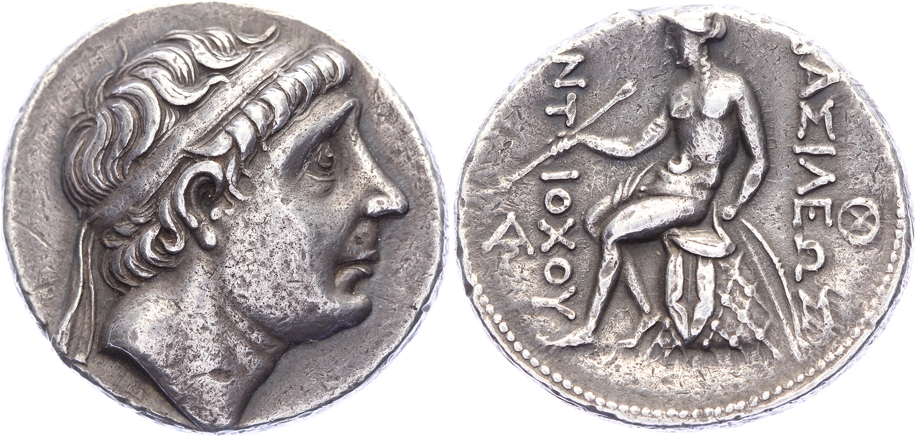 AR Tetradrachm [17,22 gm, 27,2 mm]. Seleucia on the Tigris. Struck circa 270-267 BC. Diademed head right / ΒΑΣΙΛΕΩΣ ΑΝΤΙΟΧΟΥ, Apollo seated left on omphalos, holding bow in his right hand; to left and right, monogram. CSE 952; ESM 155, Type 1; SC 379.3. SNG Spaer 290. Some marks, toned gVF.